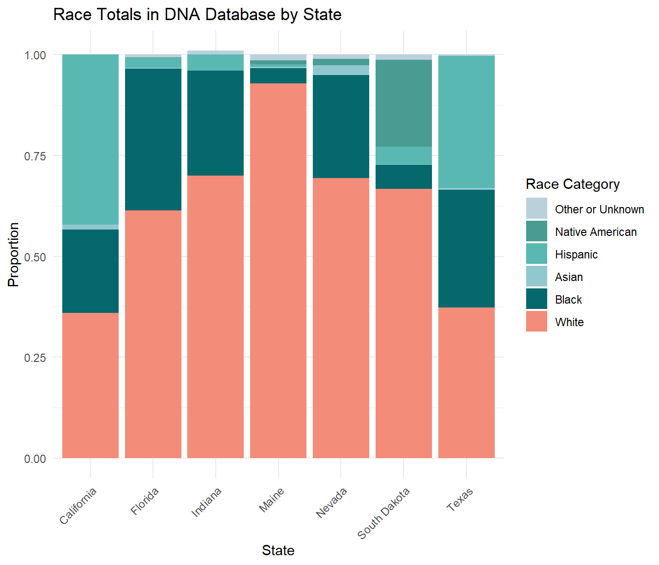 Despite White Americans usually making up the majority of the population in the database, there is still a significant disparity present in this data. Comparing this to a graph of the racial breakdown of the total population in each of these states uncovers that Black Americans and other people of color are over represented in their state’s database.