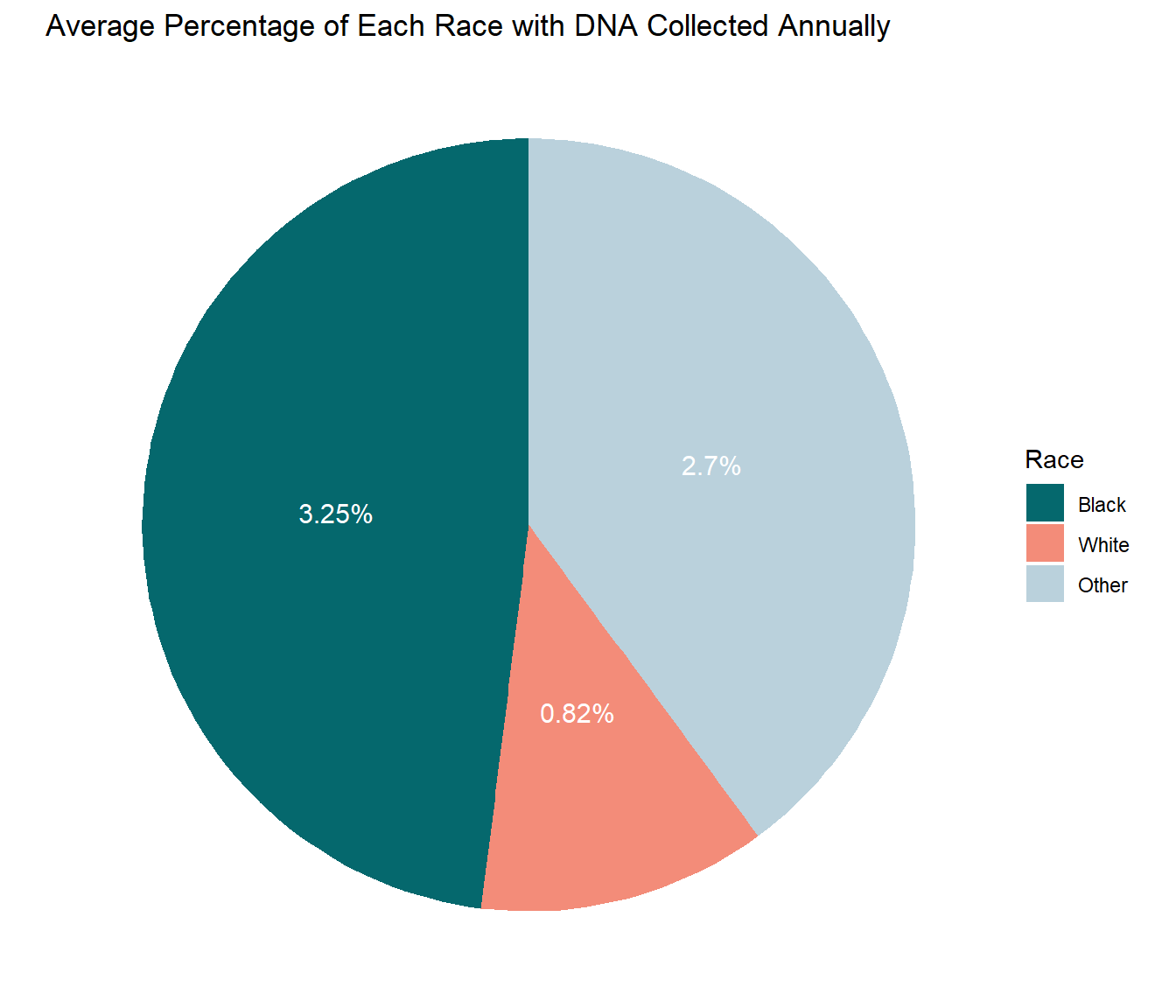 Printed below are the average proportions across all states of people whose DNA is collected annually, divided by race. For example, the average percentage of Black Americans whose DNA is collected annually is 3.25%, meaning on average, 3.25% of the Black population has DNA collected annually. Other people of color have an average of 2.7% collected annually, compared to the White population, whose average percent of population with DNA collected is only 0.82%.