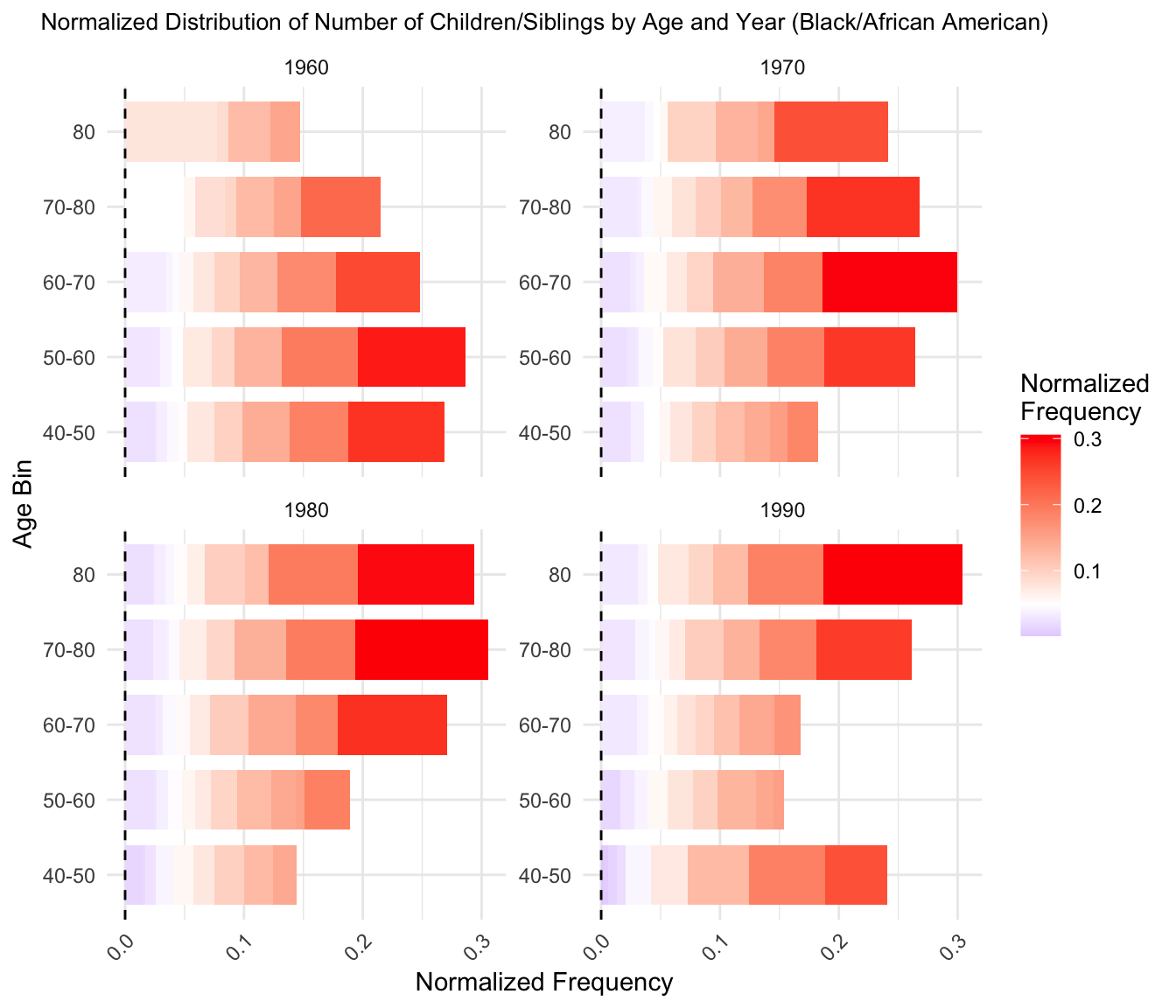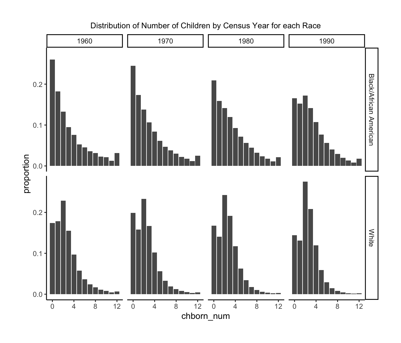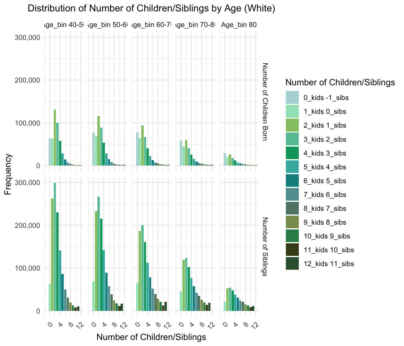 Here, we are trying to create frequency tables for each race to show the number of children born, the number of mother who has “chborn_num” children, the number of sibling, and the number of individuals who has “n_sib” siblings.