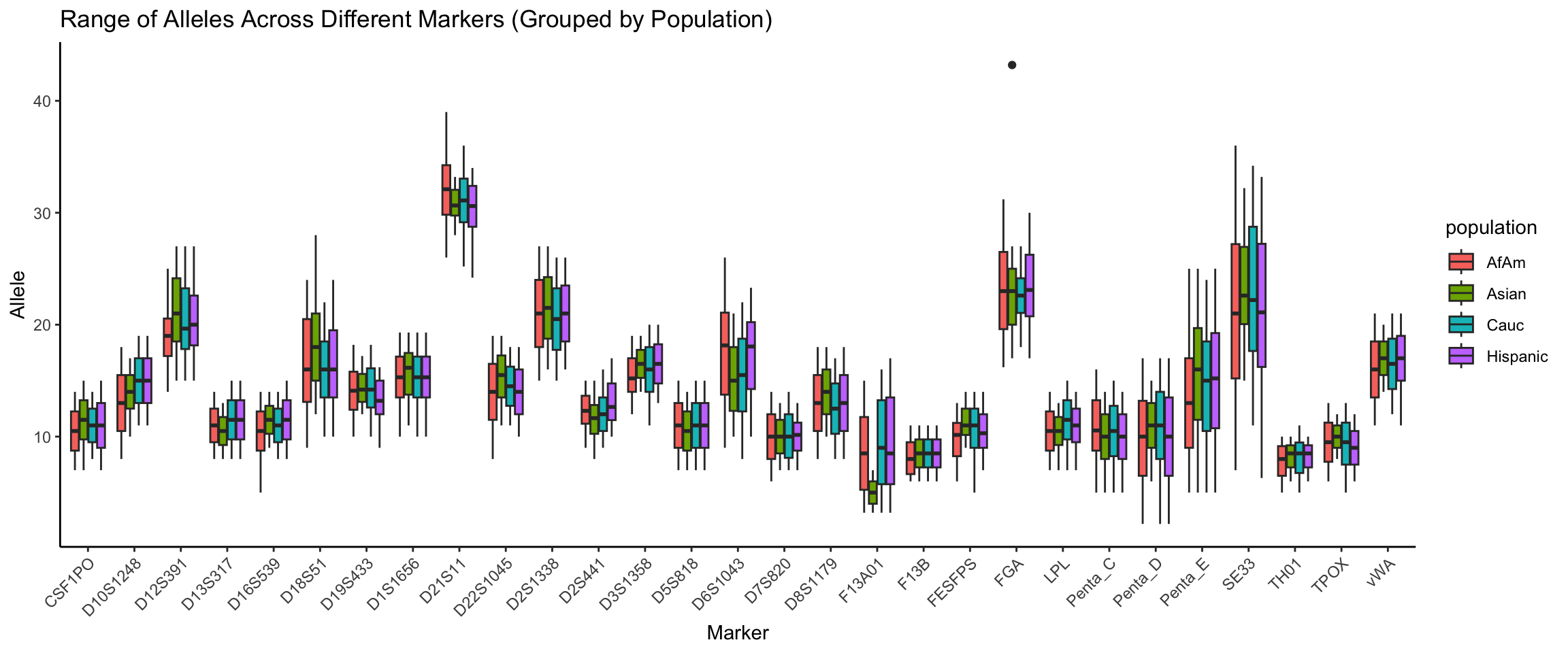 title = "Range of Alleles Across Different Markers (Grouped by Population)") +