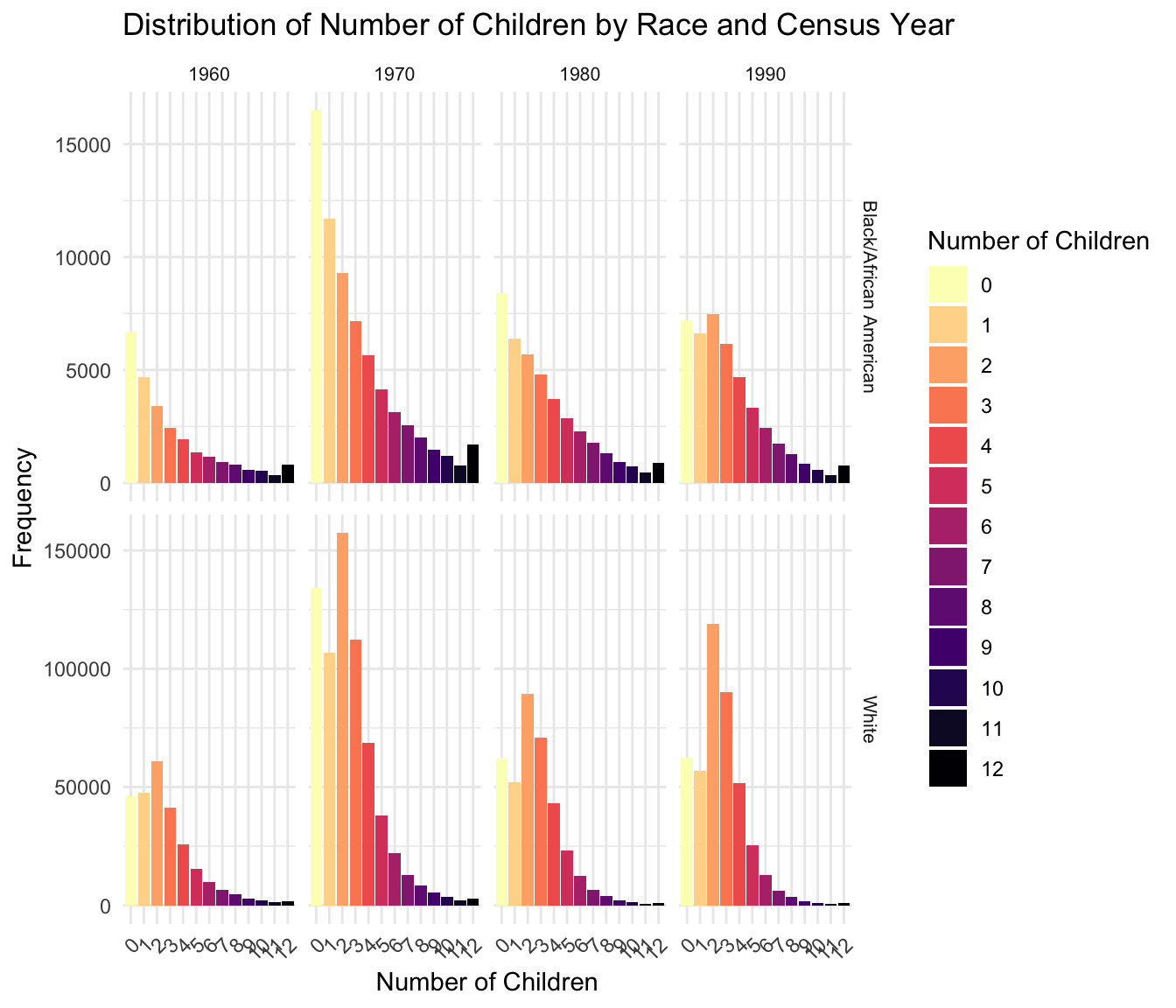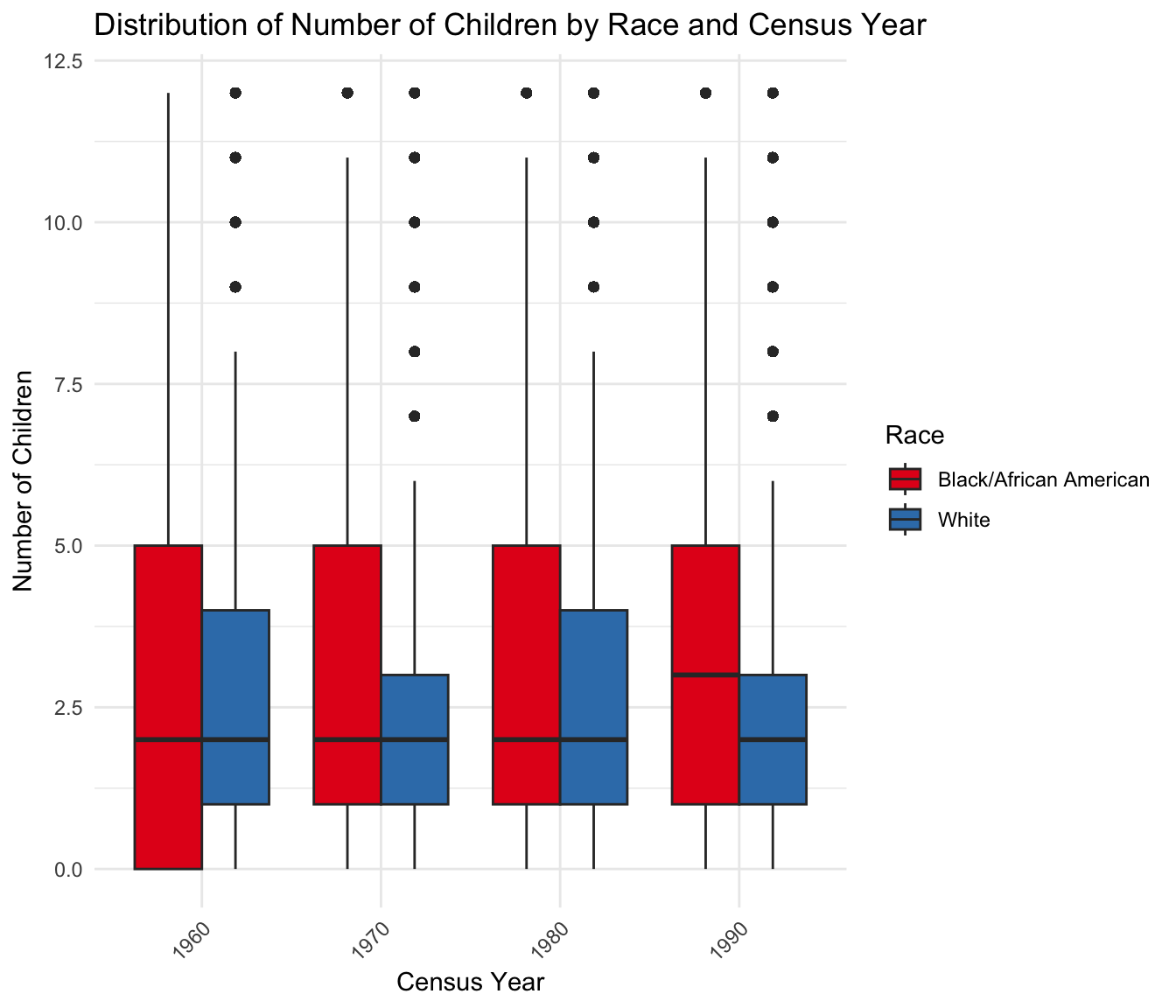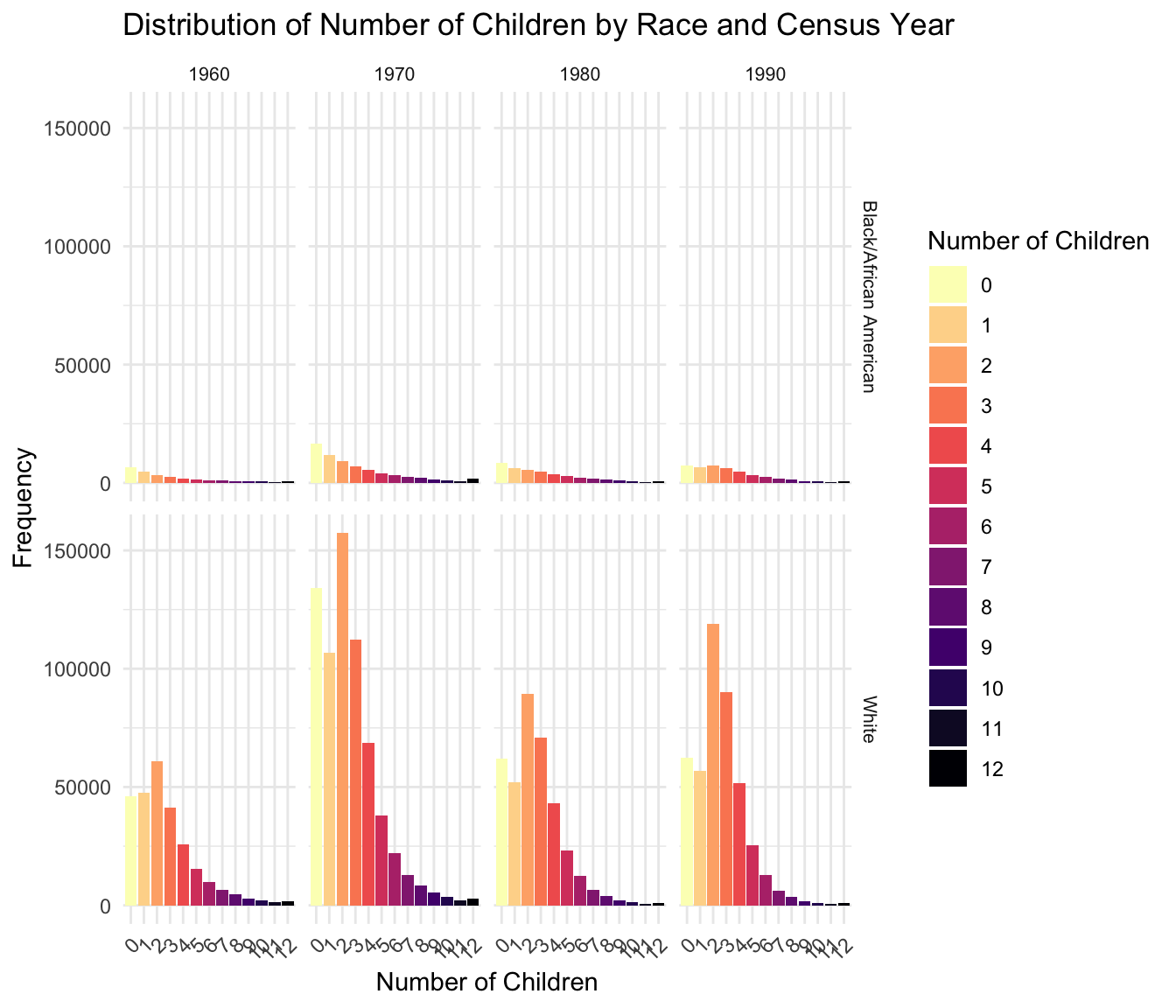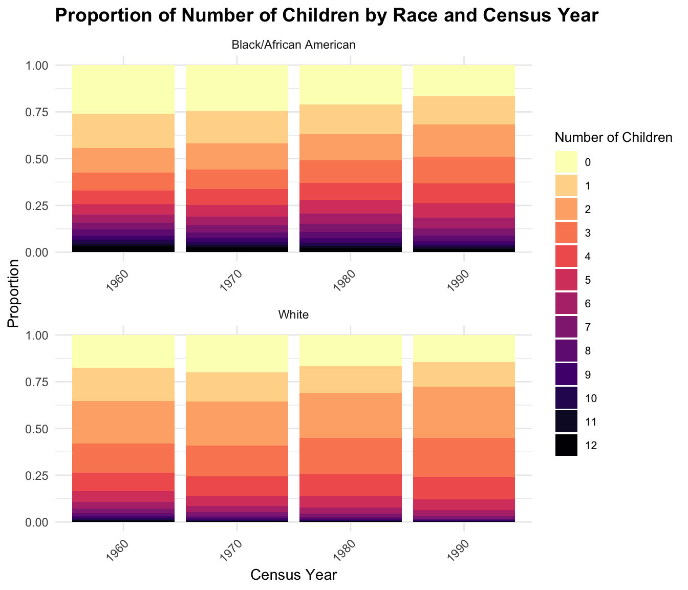 The website here has some figures from an exploratory analysis of birth rate-related data from IPUMS. Due to the terms of agreement for using this data, we cannot share the full dataset but our repo contains the subset that was used to calculate the mean number of offspring and variance.