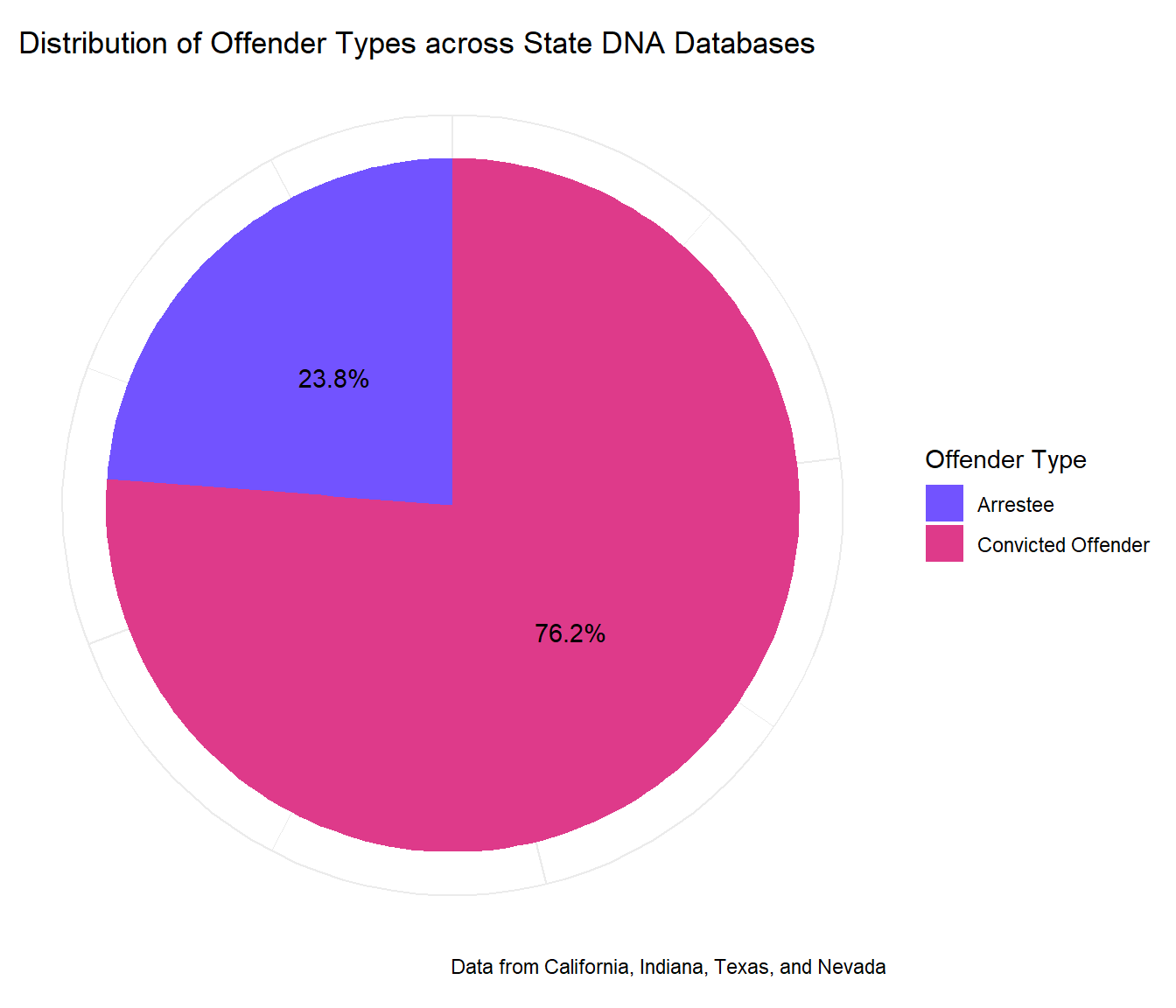 The following pie chart shows a summary of the proportions of arrestees and convicted offenders in the state DNA databases.