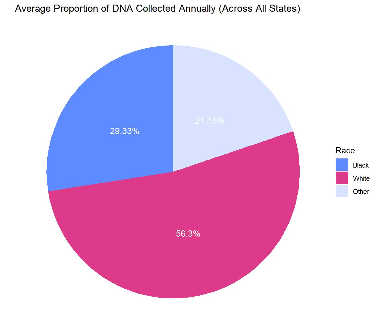 These pie charts show the comparison of the proportion of races with DNA collected and the racial breakdown of the population across all states. We can clearly see from these charts the overwhelming over representation of Black Americans with DNA collected annually compared to the percentage of the population that they make up. The same thing is true for other people of color, and the opposite is true for White Americans, whose DNA is less likely to be collected.