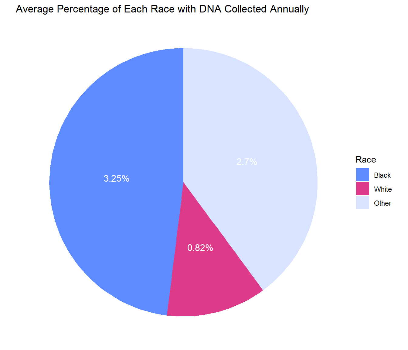 Printed below are the average proportions across all states of people whose DNA is collected annually, divided by race. For example, the average percentage of Black Americans whose DNA is collected annually is 3.25%, meaning on average, 3.25% of the Black population has DNA collected annually. Other people of color have an average of 2.7% collected annually, compared to the White population, whose average percent of population with DNA collected is only 0.82%.