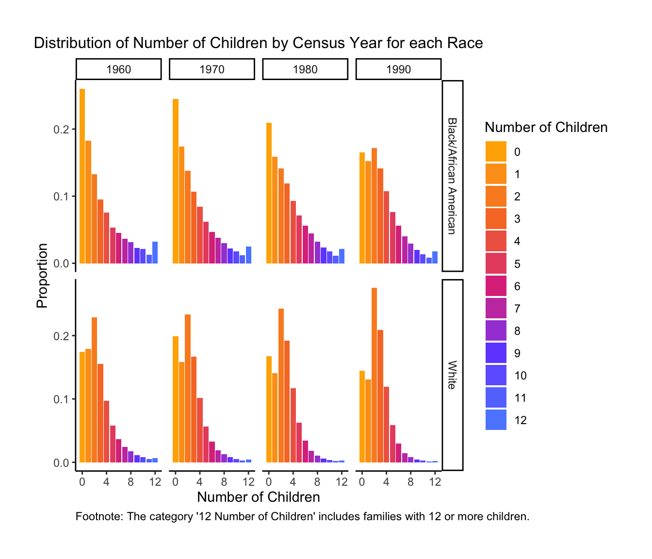 Note: Focusing on mothers in the 50-60 age range, the graph shows that family size in both racial group has generally decreased over time, with fewer families having a large number of children in the more recent years (1980 and 1990). In addition, it also shows a racial disparity between racial groups. Black/African American families consistently have a higher proportion of larger families compared to White families across all years.