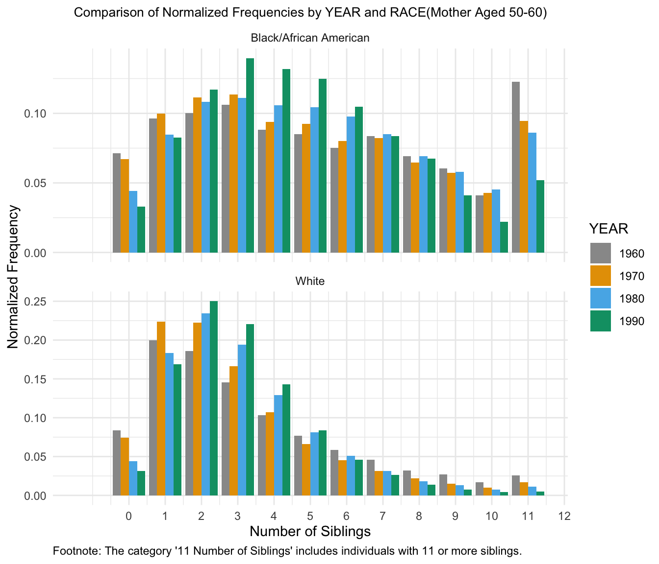 Note: Both Black/African American and White populations has diminishing trend of having larger sibling groups over the decades. However, the graph indicates differences in sibling numbers between the two racial groups. Black/African American individuals are more likely to have larger numbers of siblings across all census years compared to White individuals.