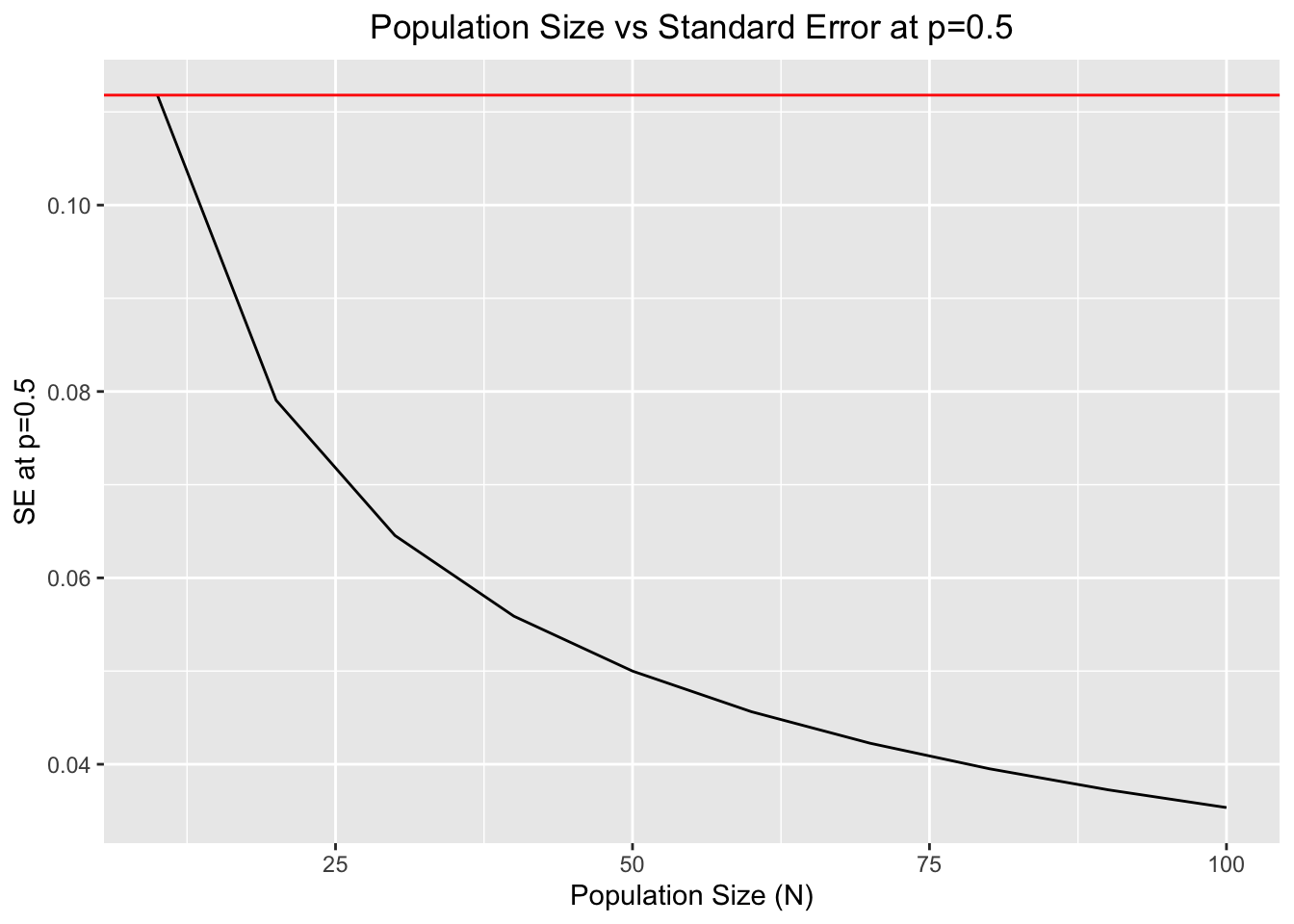 ggplot(df,aes(x=N,y=SE))+geom_line()+xlab("Population Size (N)")+ylab("SE at p=0.5")+ggtitle("Population Size vs Standard Error at p=0.5")+theme(plot.title = element_text(hjust = 0.5))+geom_hline(yintercept = max(SE),color="red")