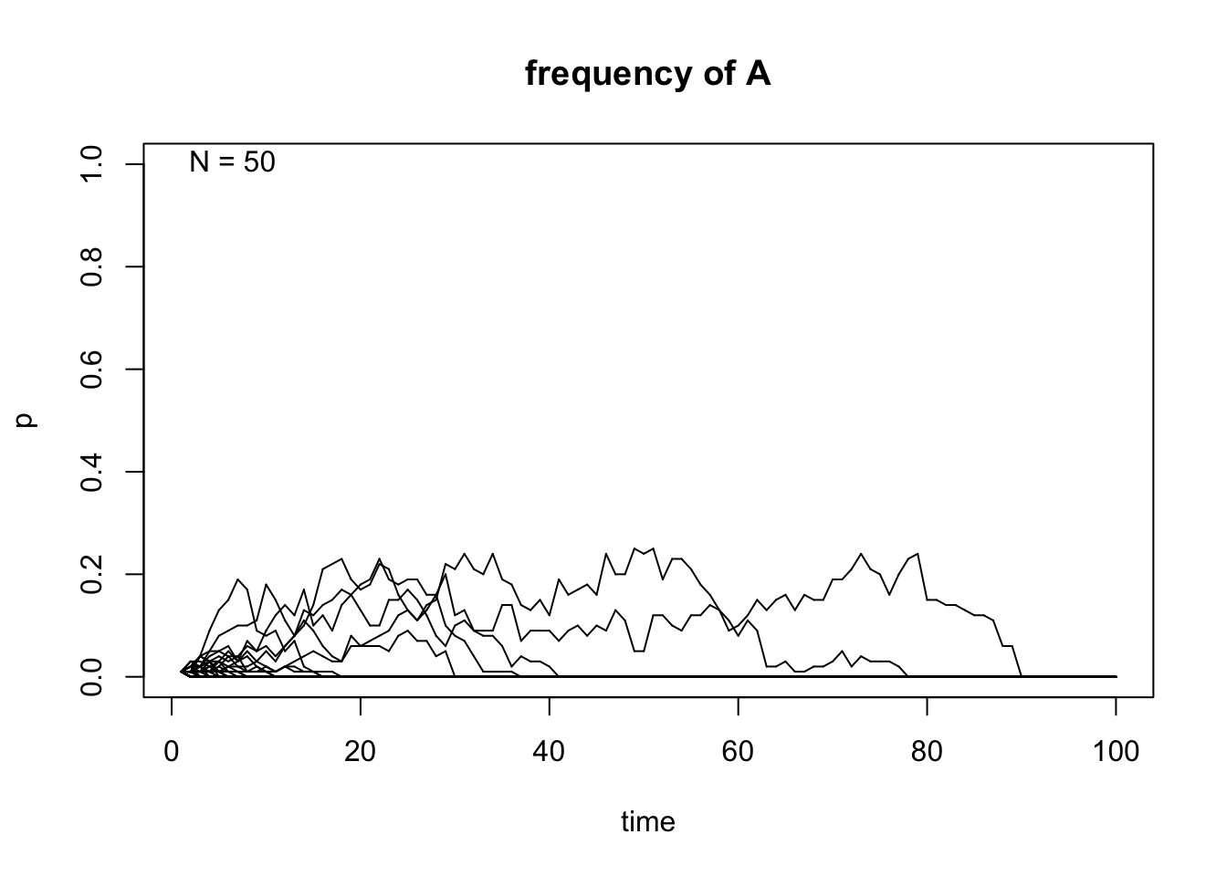 genetic.drift(p0=0.01,Ne=500,nrep=50, time=100, show = "p",pause = 0.1)
