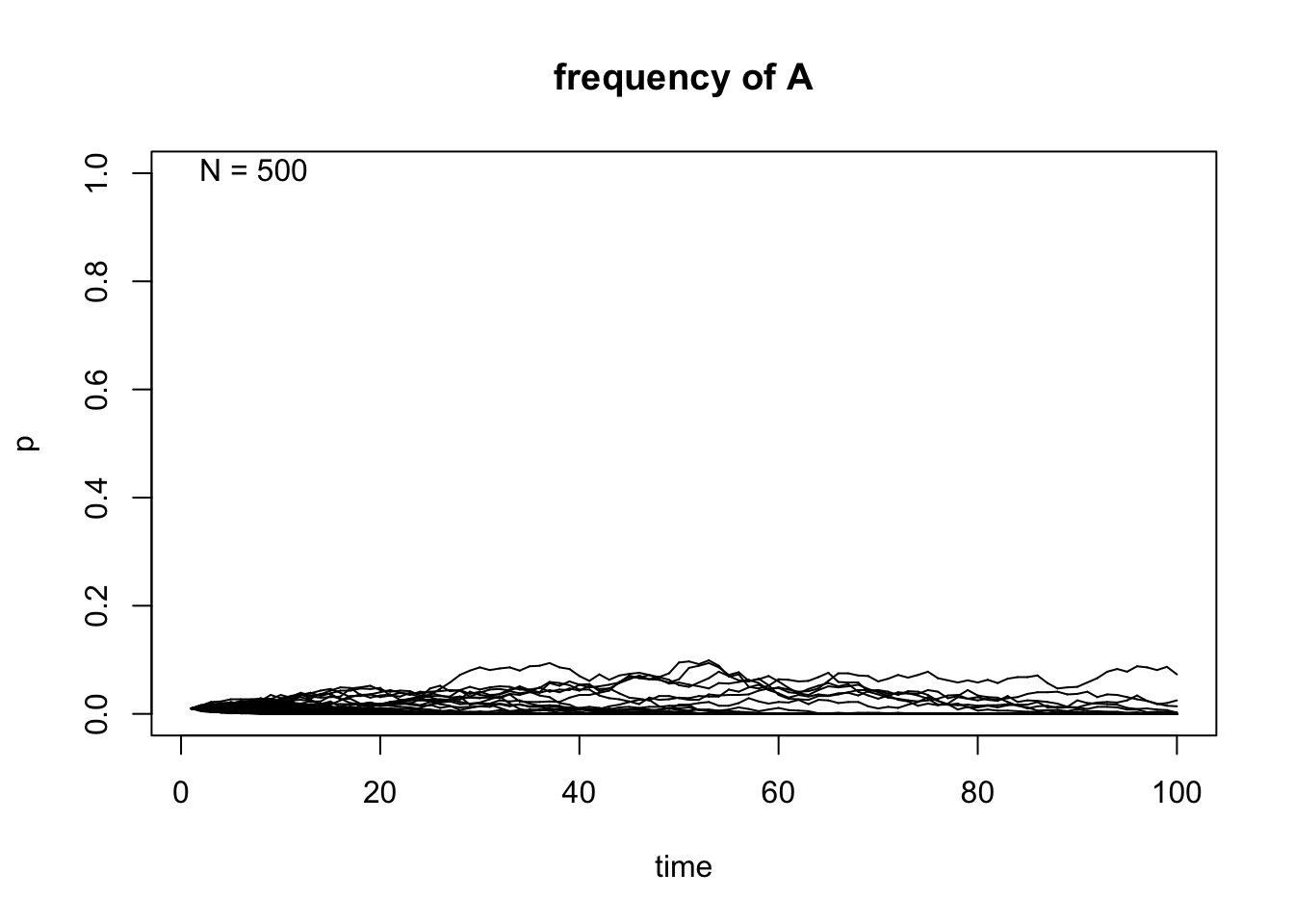 # Initial frequency p=0.01,N=50,500 and 50 population replicates