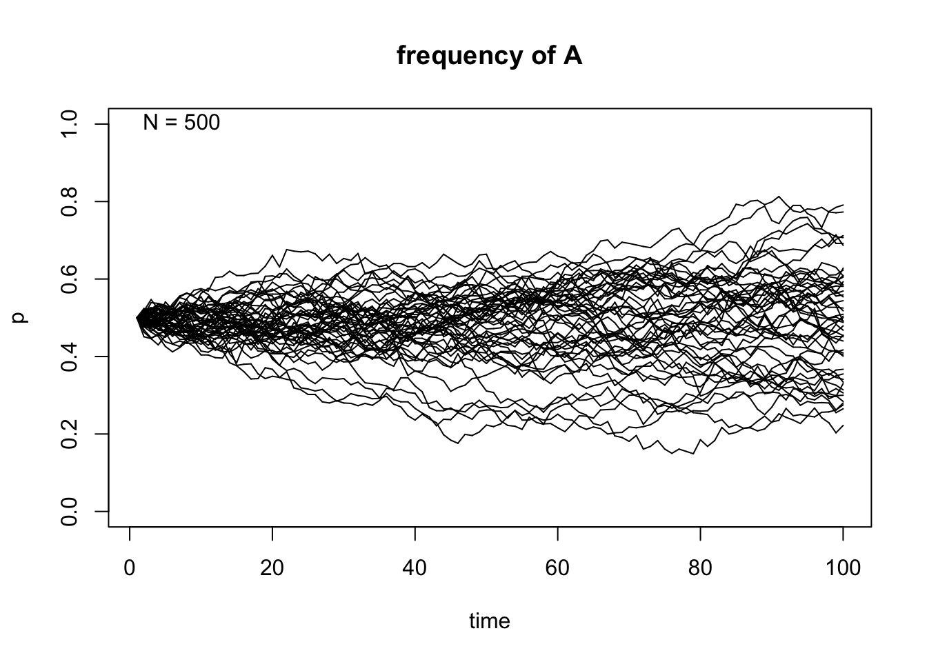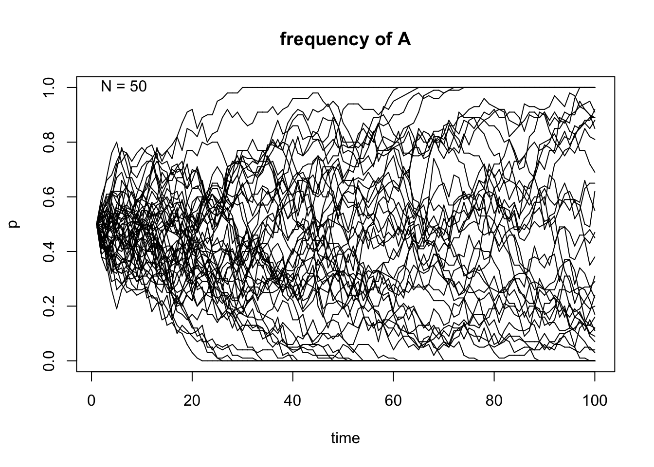 genetic.drift(p0=0.5,Ne=500,nrep=50, time=100, show = "p",pause = 0.1)