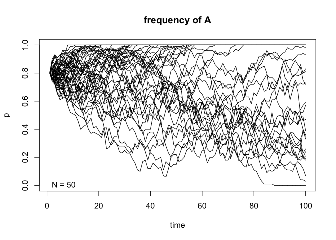 genetic.drift(p0=0.8,Ne=50,nrep=50, time=100, show = "p",pause = 0.1)