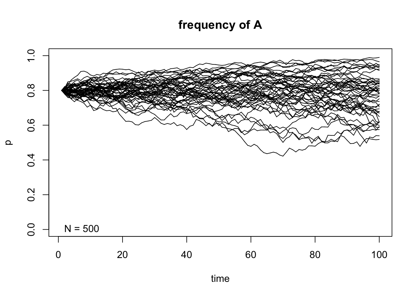 # Initial frequency p=0.8,N=50,500 and 50 population replicates