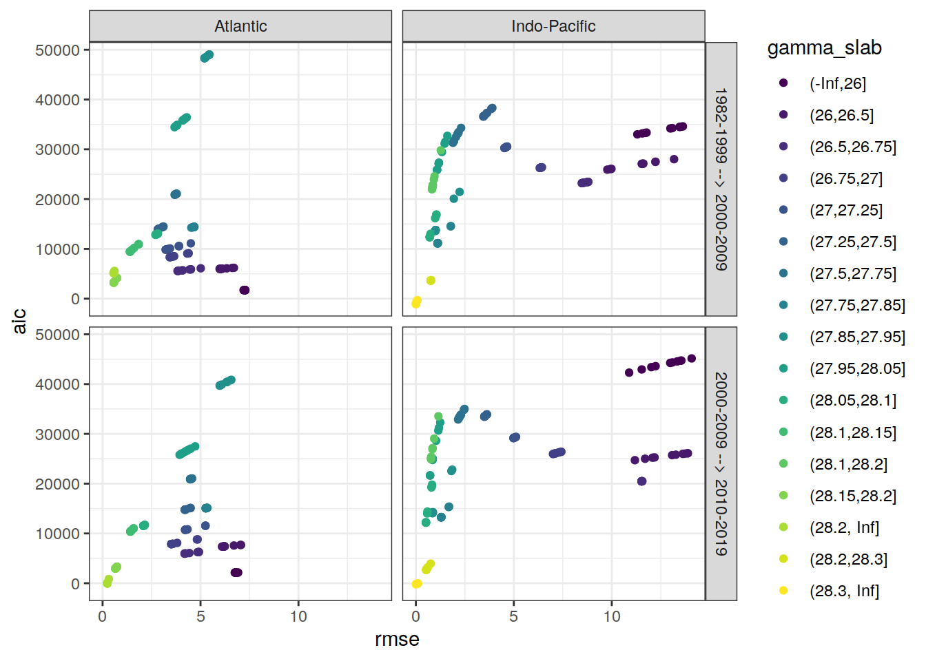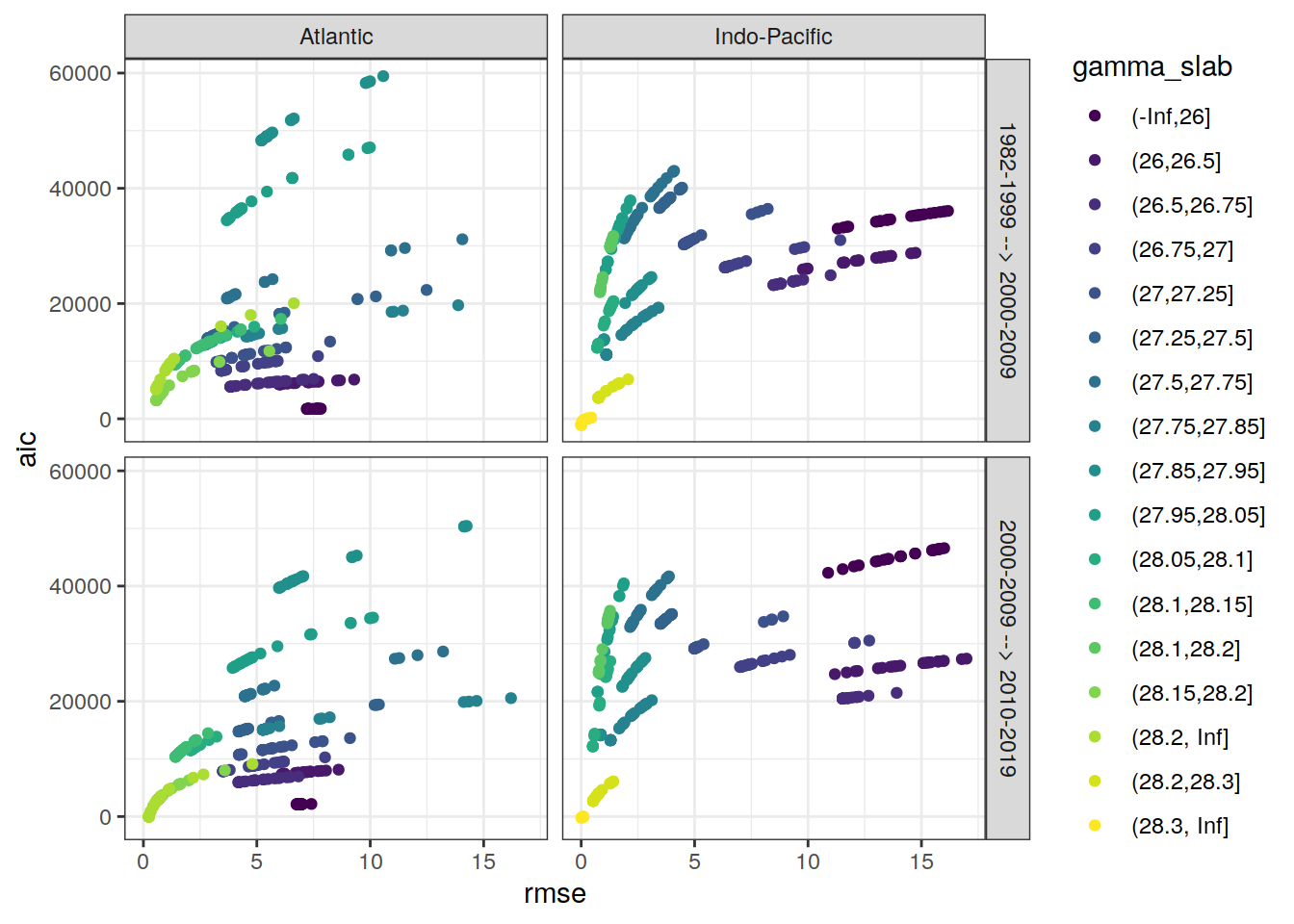 ggplot(aes(rmse, aic, col = gamma_slab)) +