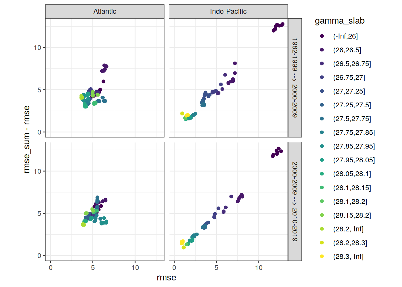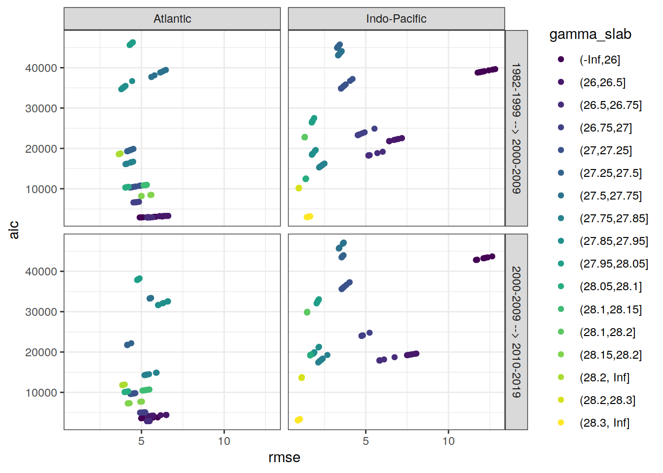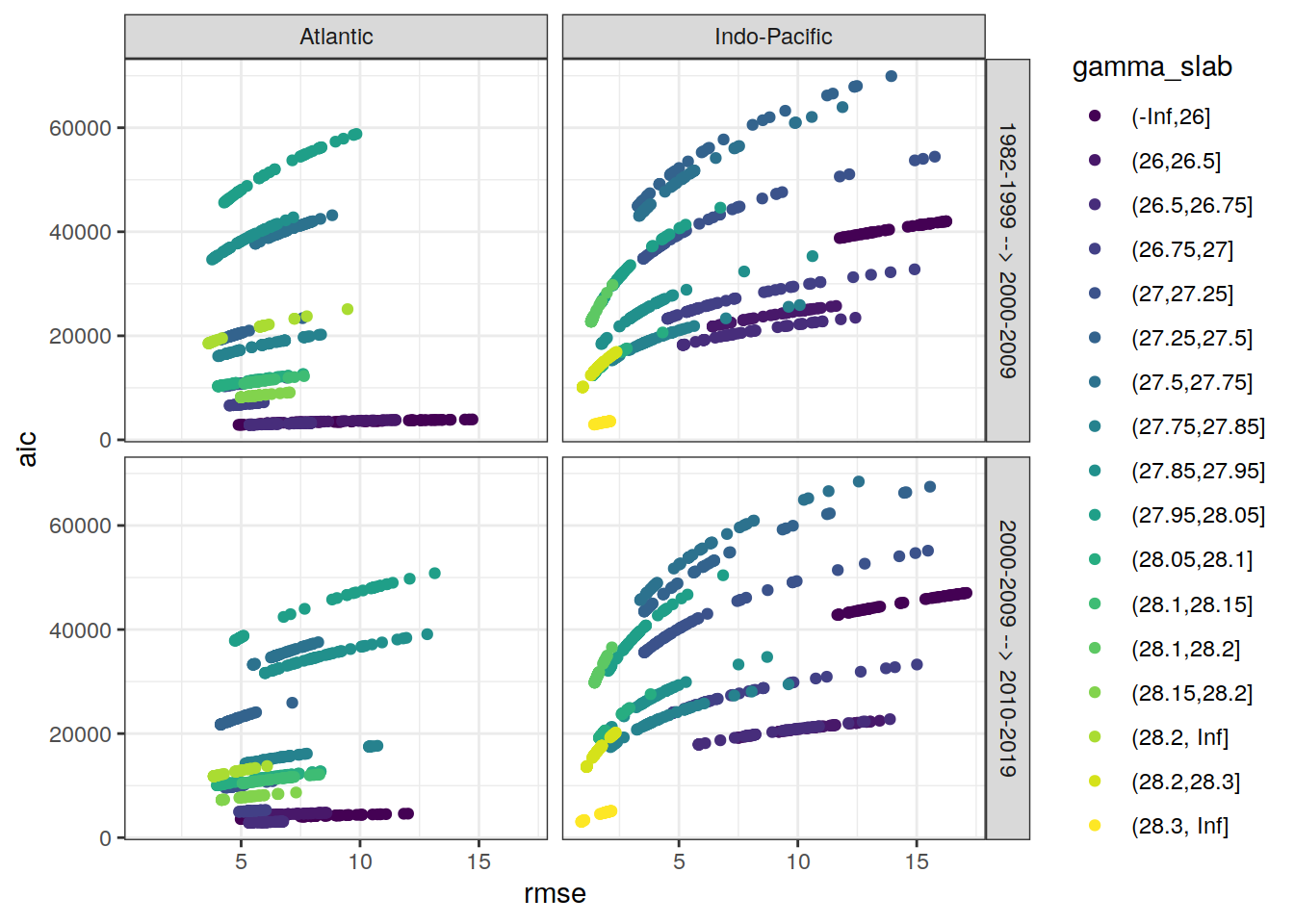ggplot(aes(rmse, aic, col = gamma_slab)) +