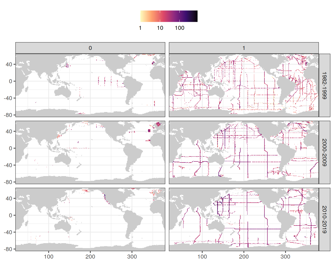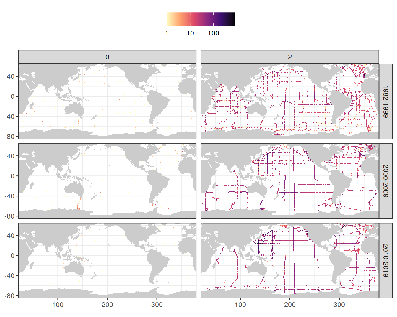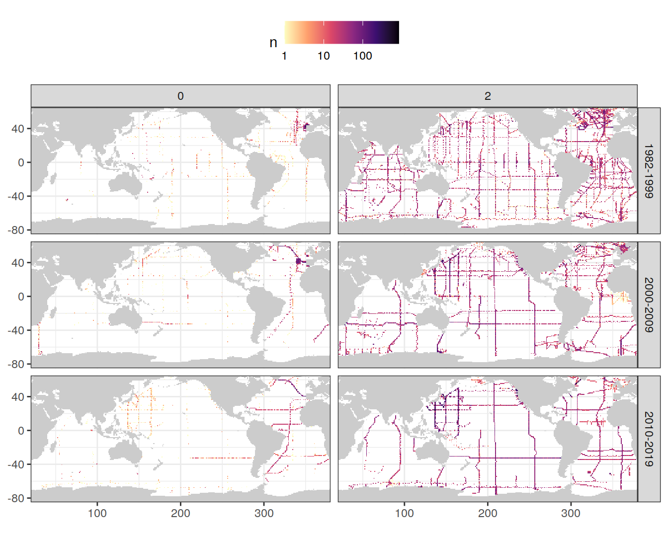 The following plots show the remaining data density in each grid cell after all cleaning steps, separately for each era.
