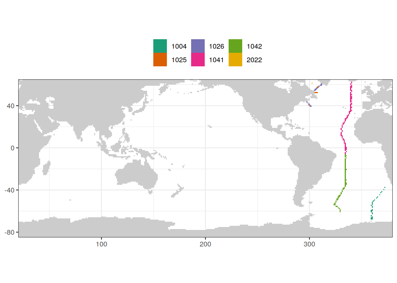 # geom_raster(data = GLODAP_tco2_grid, aes(lon, lat), fill = "grey80") +