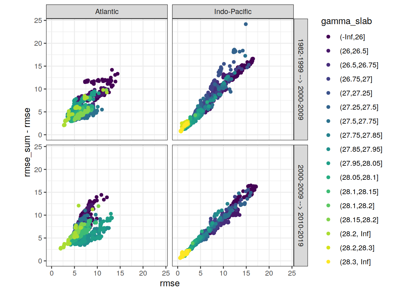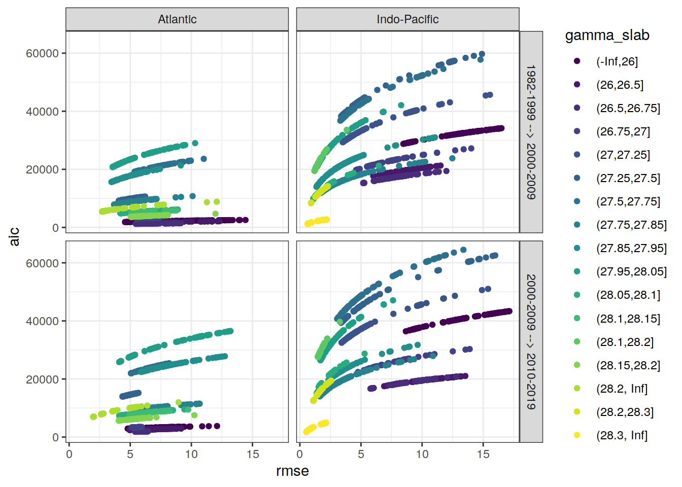 ggplot(aes(rmse, aic, col = gamma_slab)) +