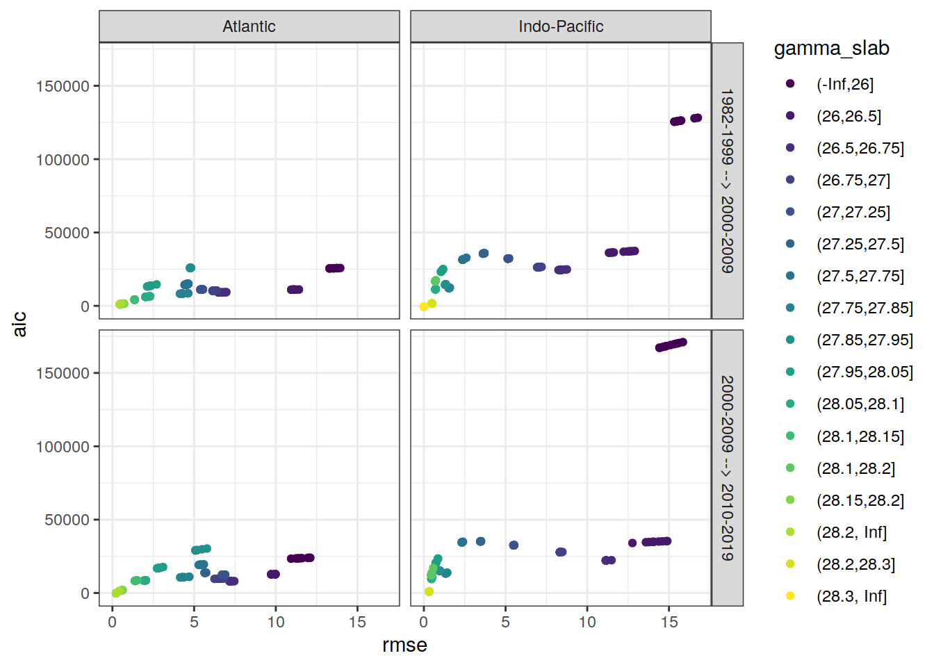 ggplot(aes(rmse, aic, col = gamma_slab)) +