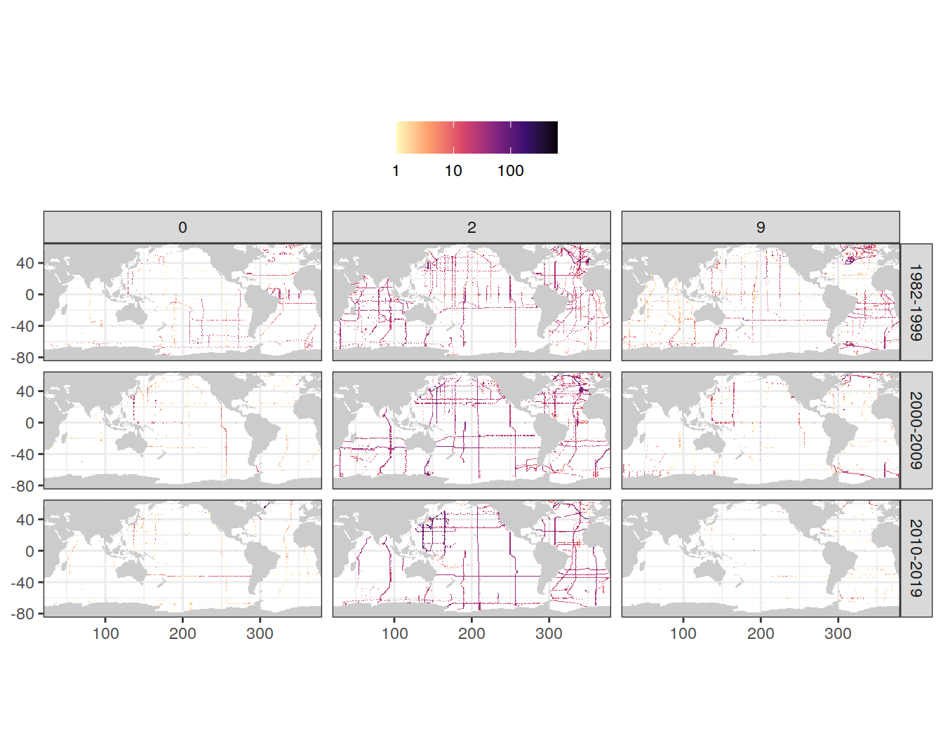 # geom_raster(data = GLODAP_tco2_grid, aes(lon, lat), fill = "grey80") +