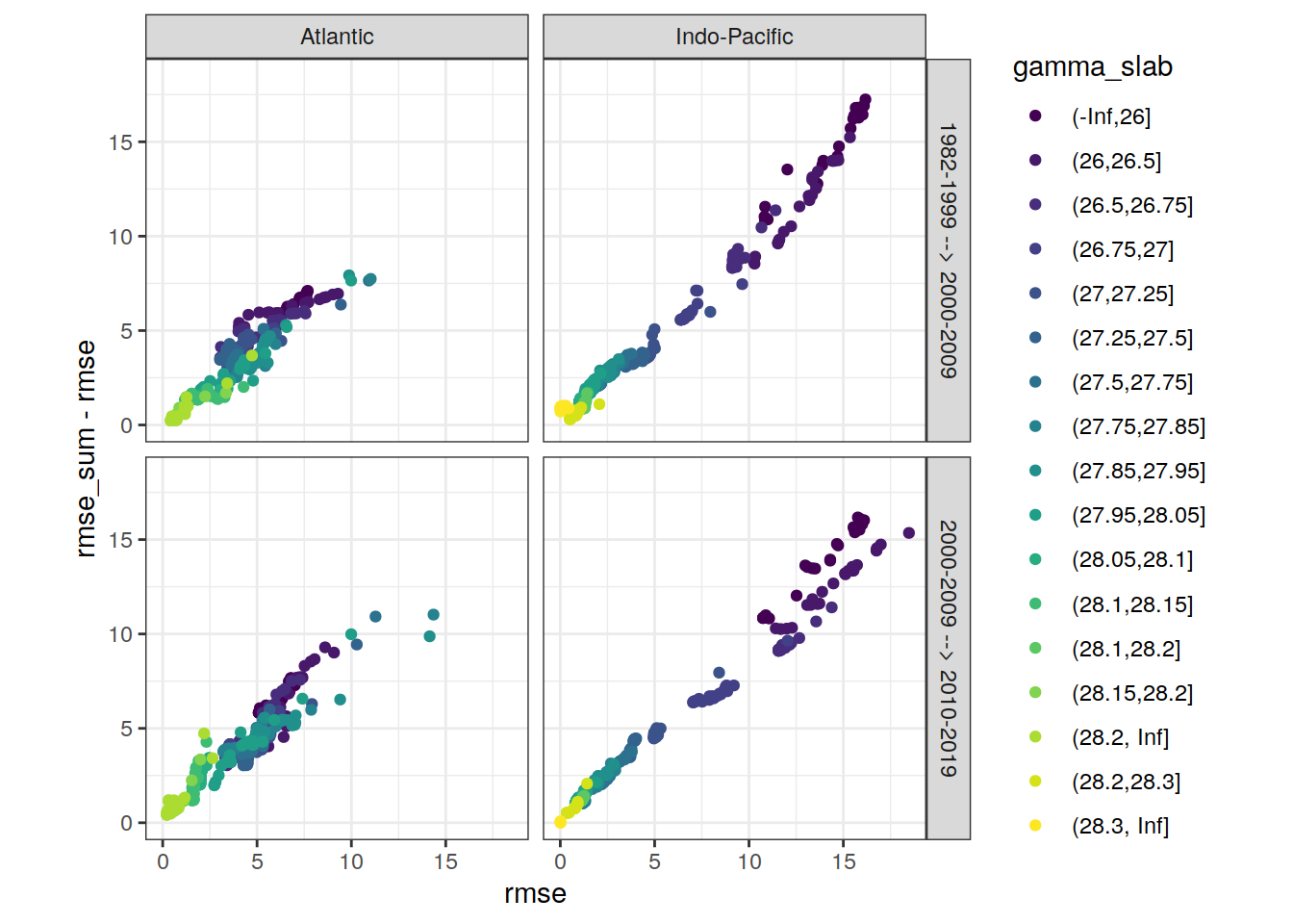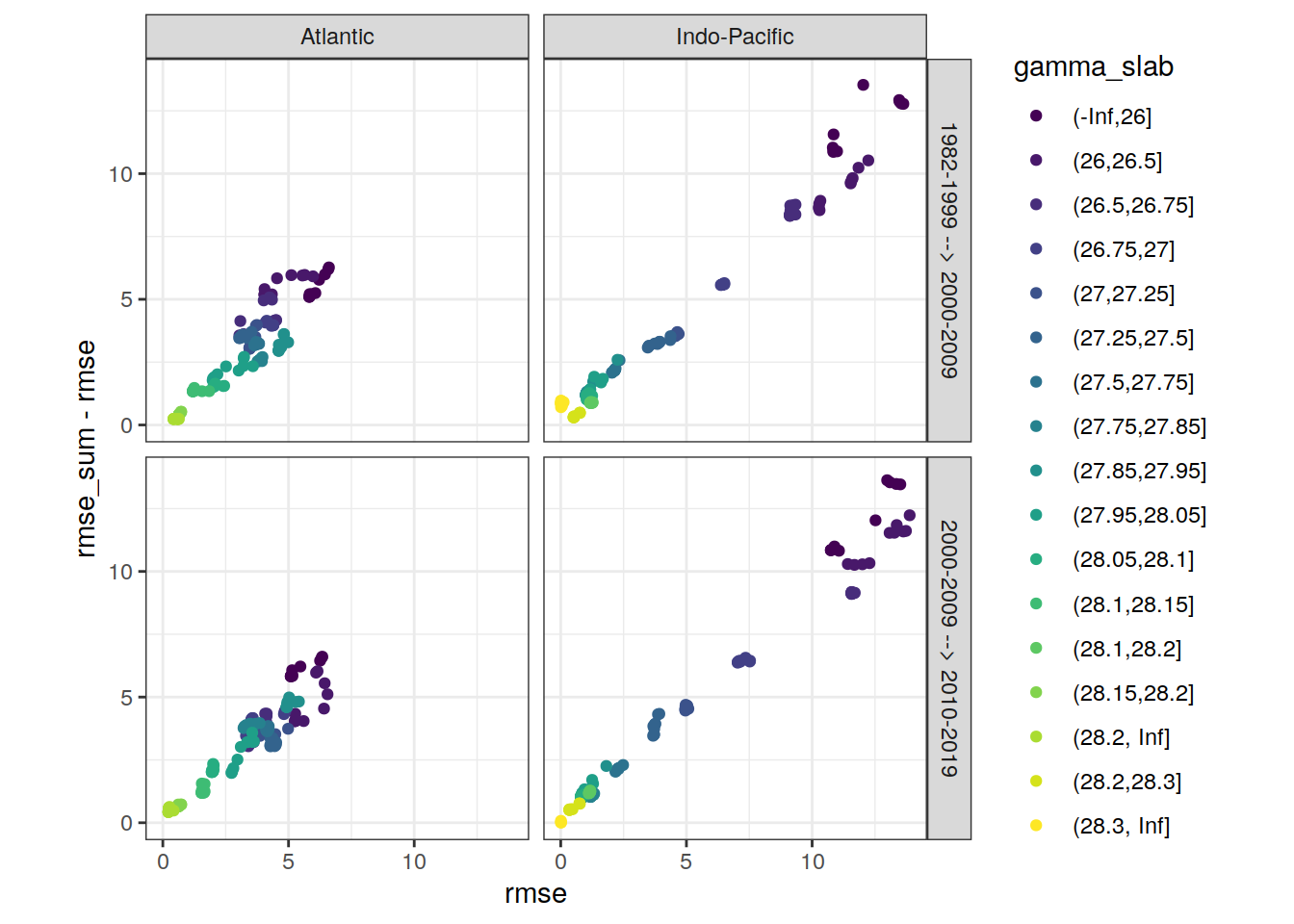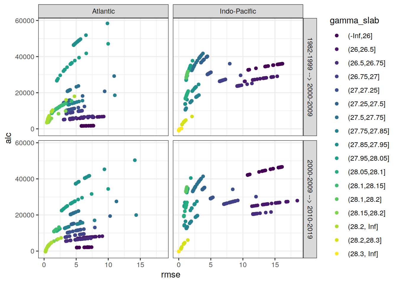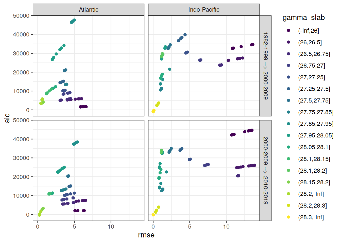 ggplot(aes(rmse, aic, col = gamma_slab)) +