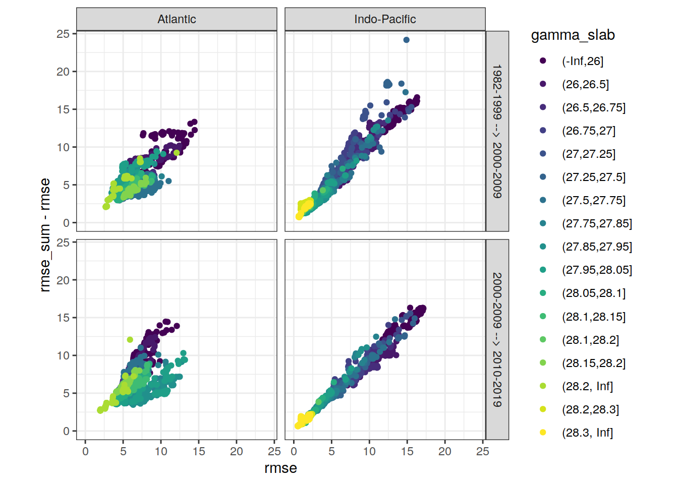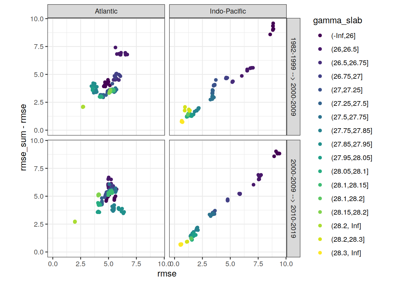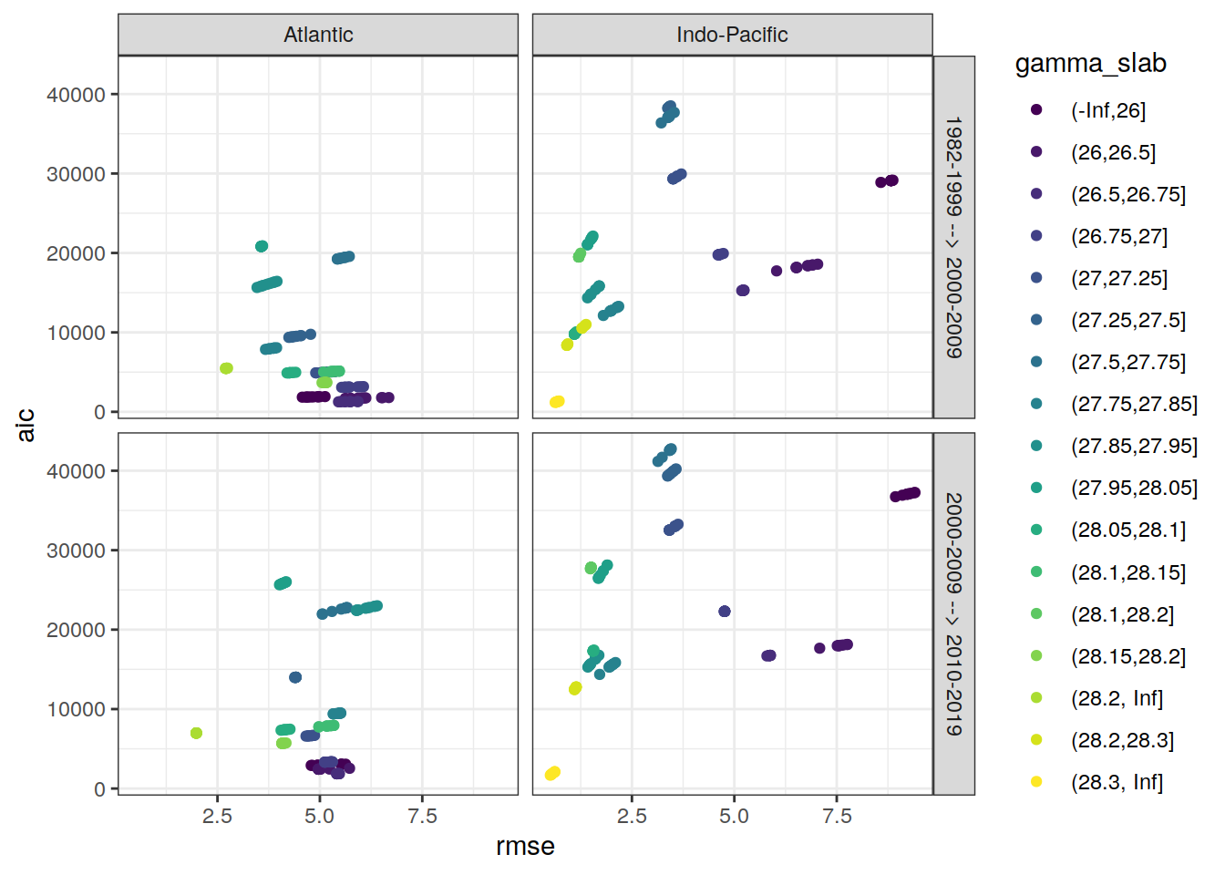 ggplot(aes(rmse, aic, col = gamma_slab)) +