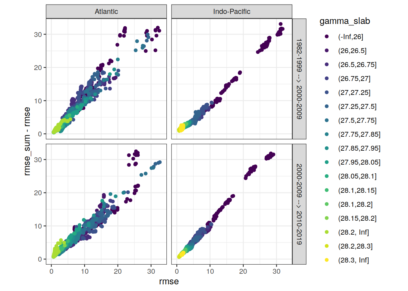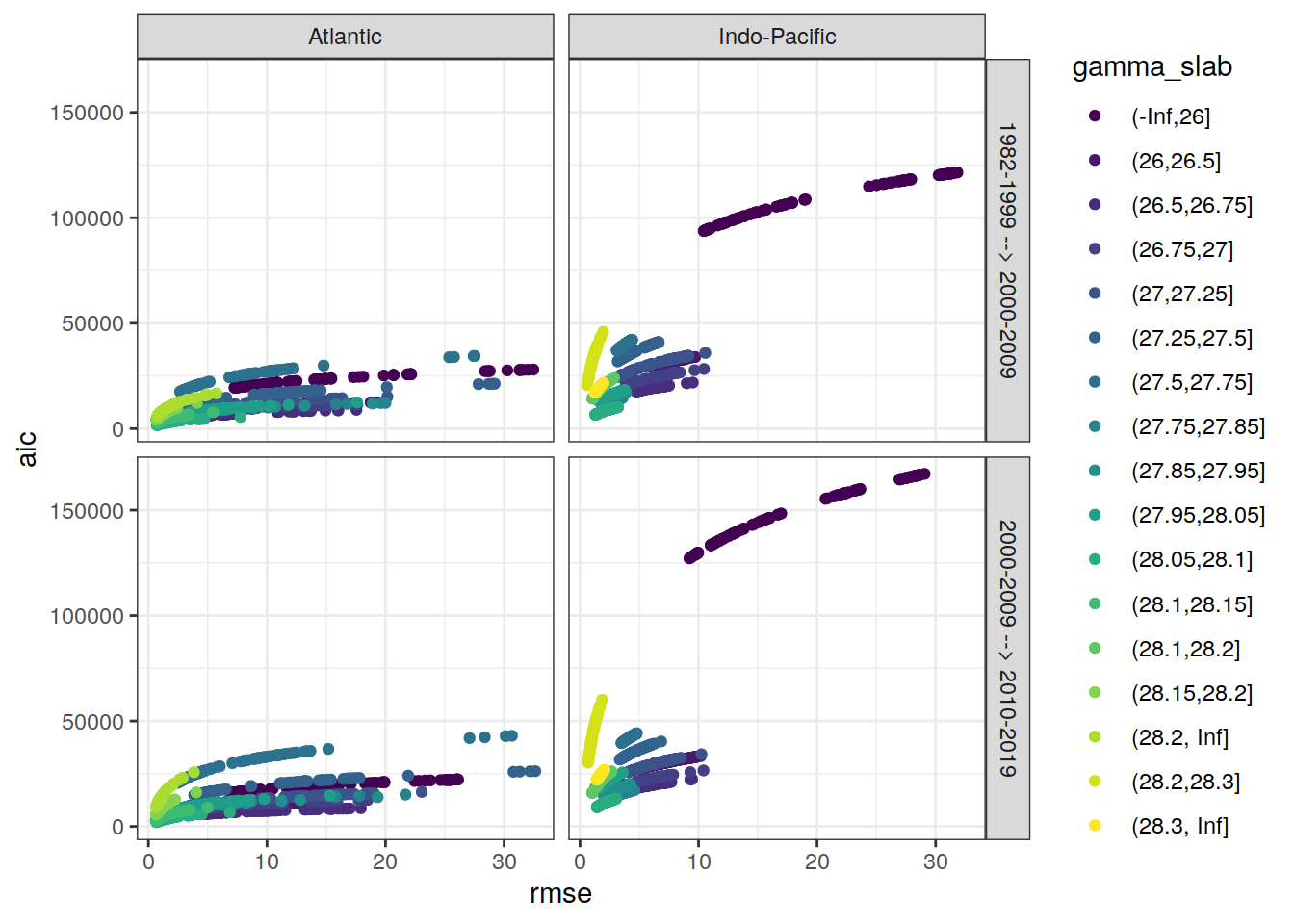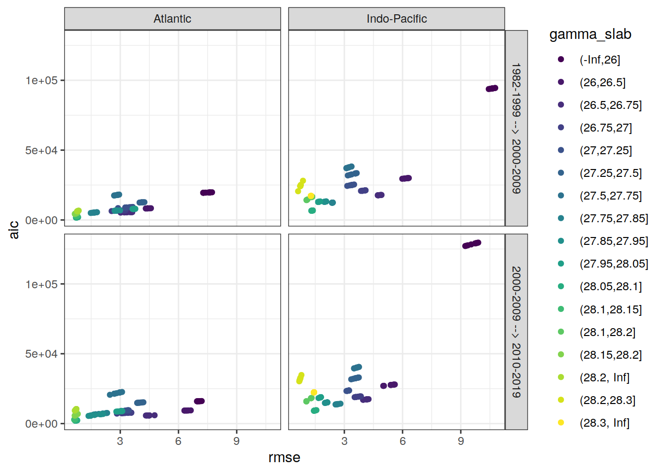ggplot(aes(rmse, aic, col = gamma_slab)) +
