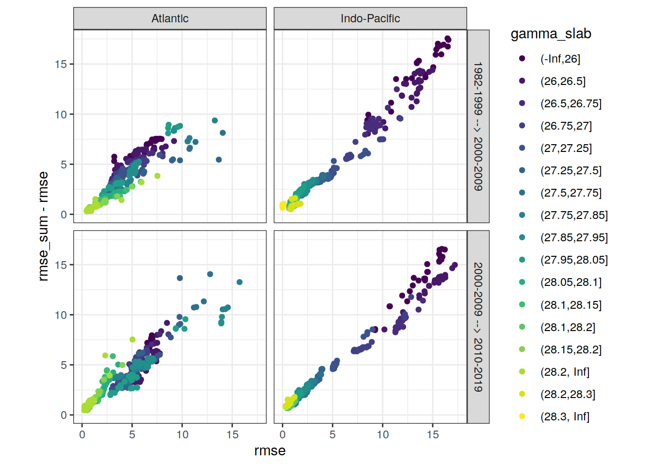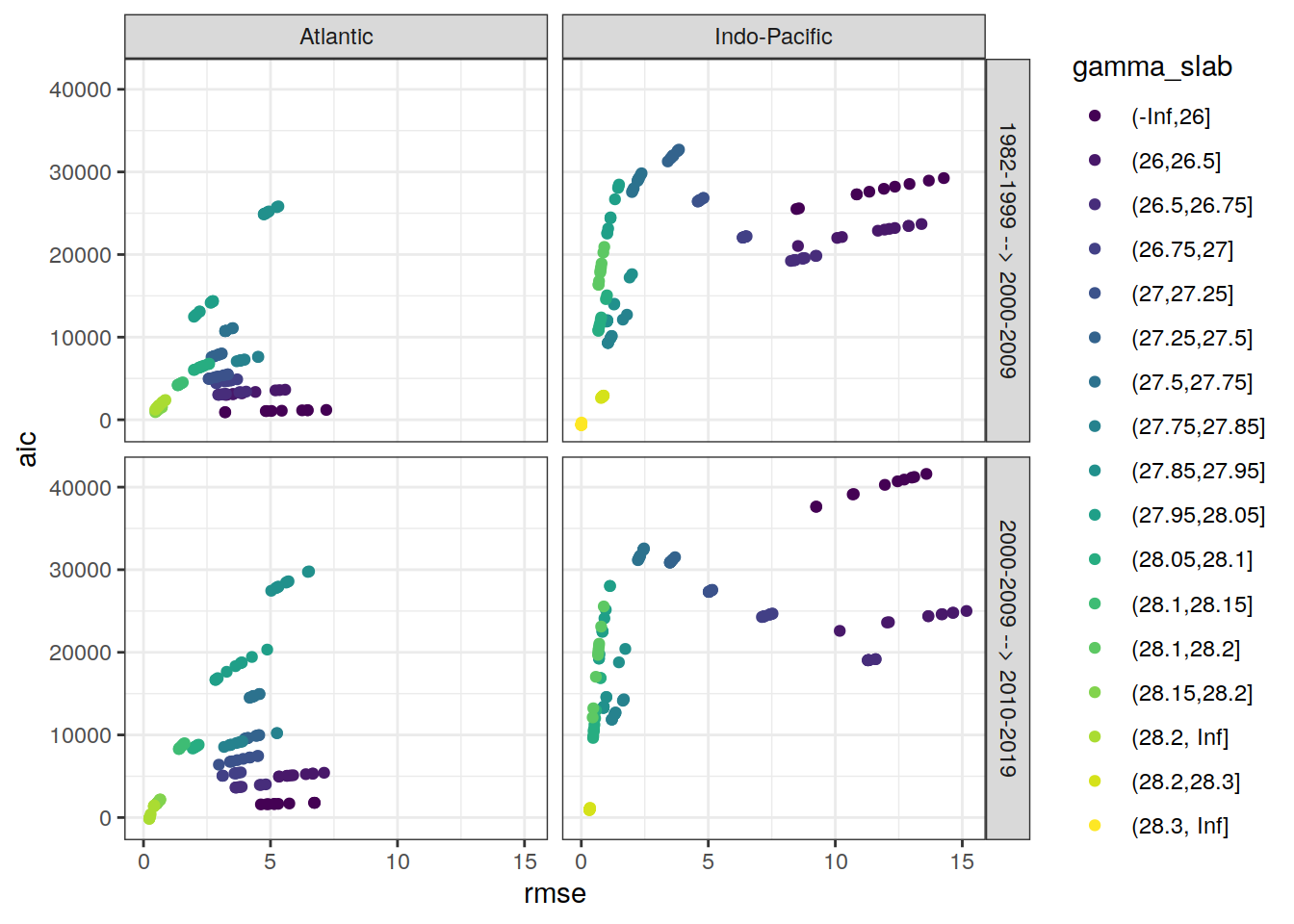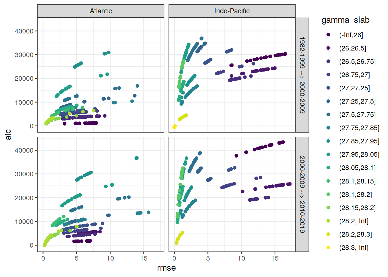 ggplot(aes(rmse, aic, col = gamma_slab)) +