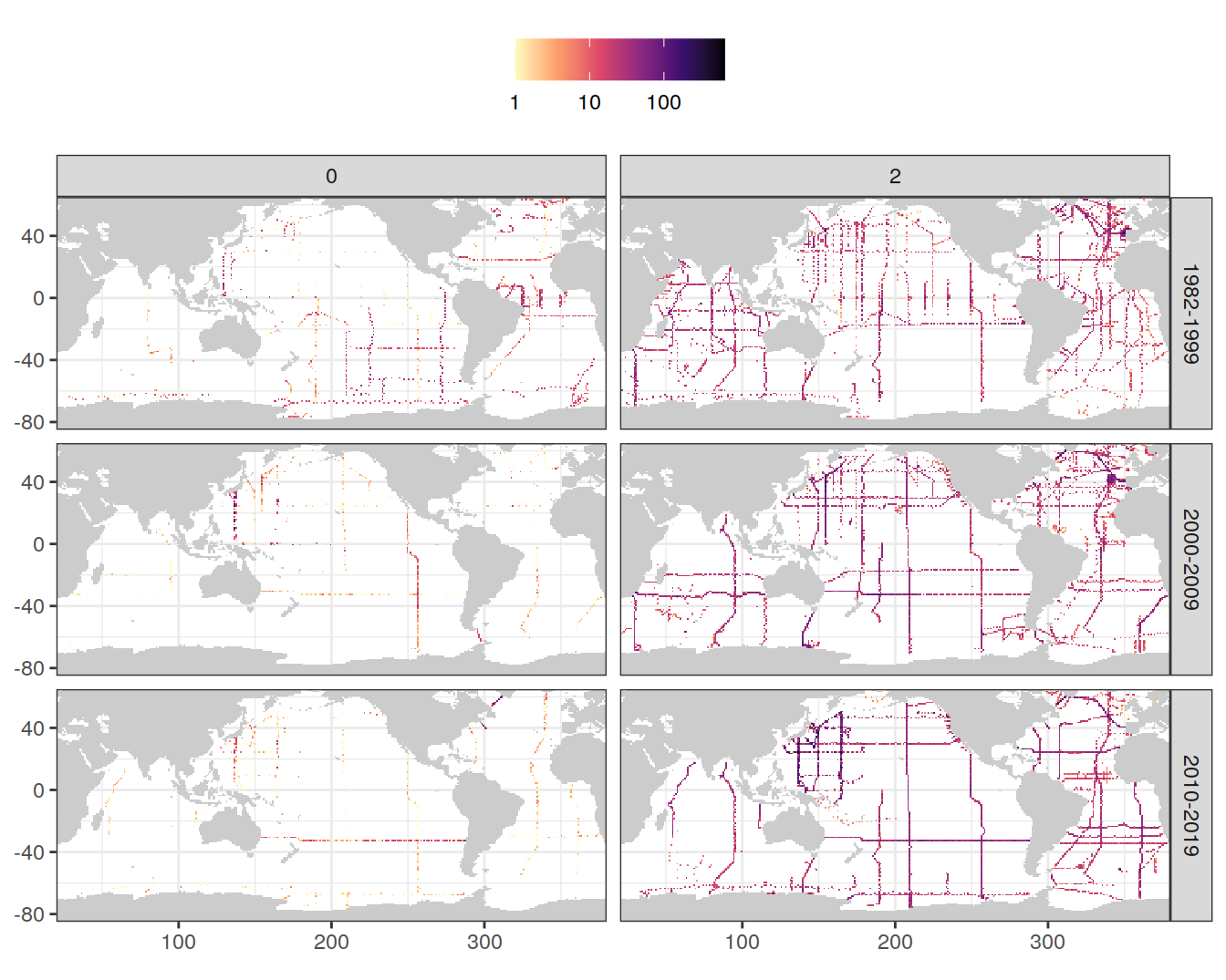 The following plots show the remaining data density in each grid cell after all cleaning steps, separately for each era.