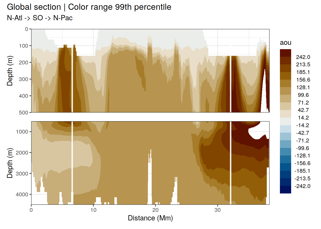 AOU was calculated as the difference between saturation concentration and observed concentration. CAVEAT: Algorithms used to calculate oxygen saturation concentration are not yet identical in GLODAP data set (fitting) and predictor climatologies (mapping).