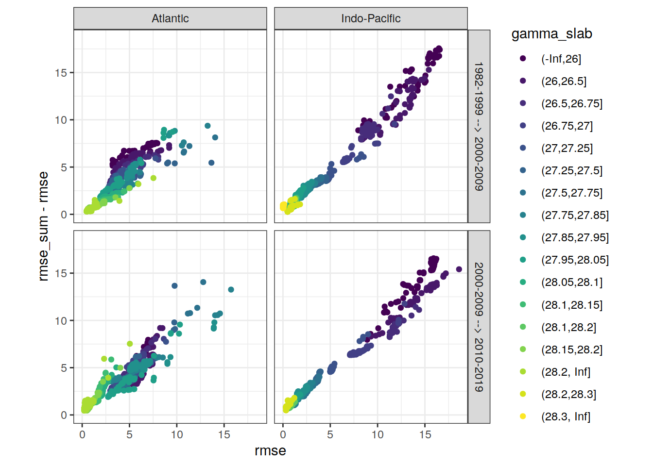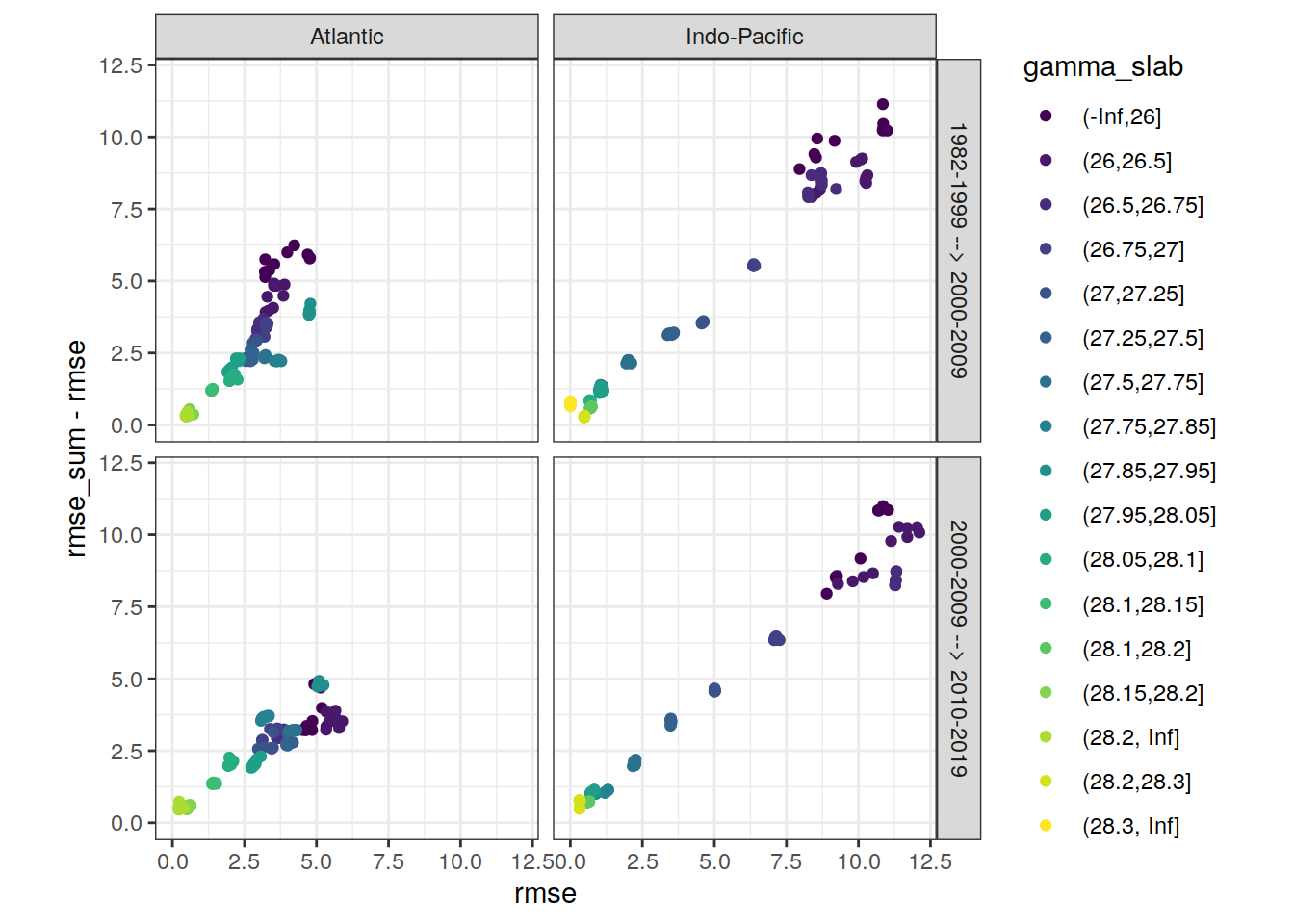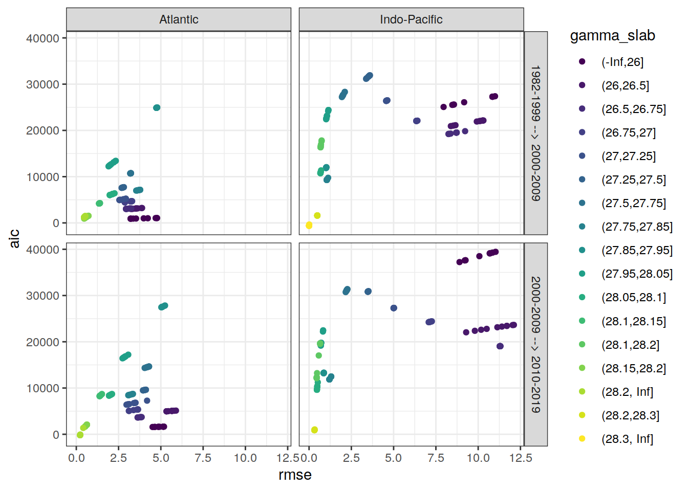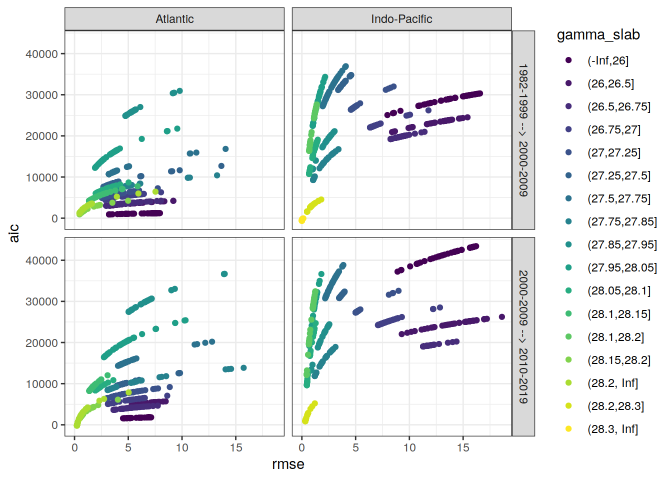 ggplot(aes(rmse, aic, col = gamma_slab)) +