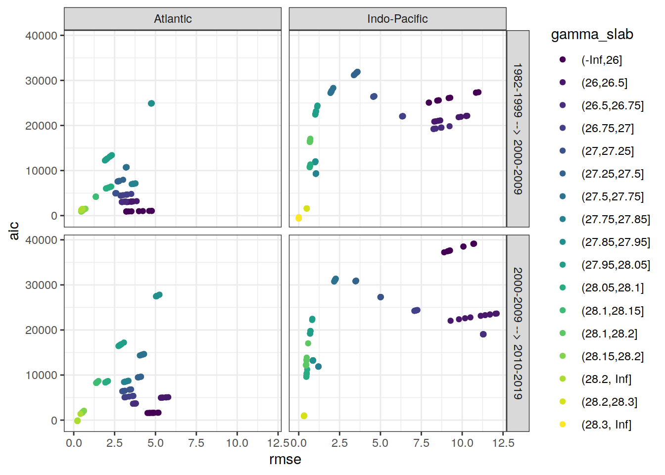 ggplot(aes(rmse, aic, col = gamma_slab)) +
