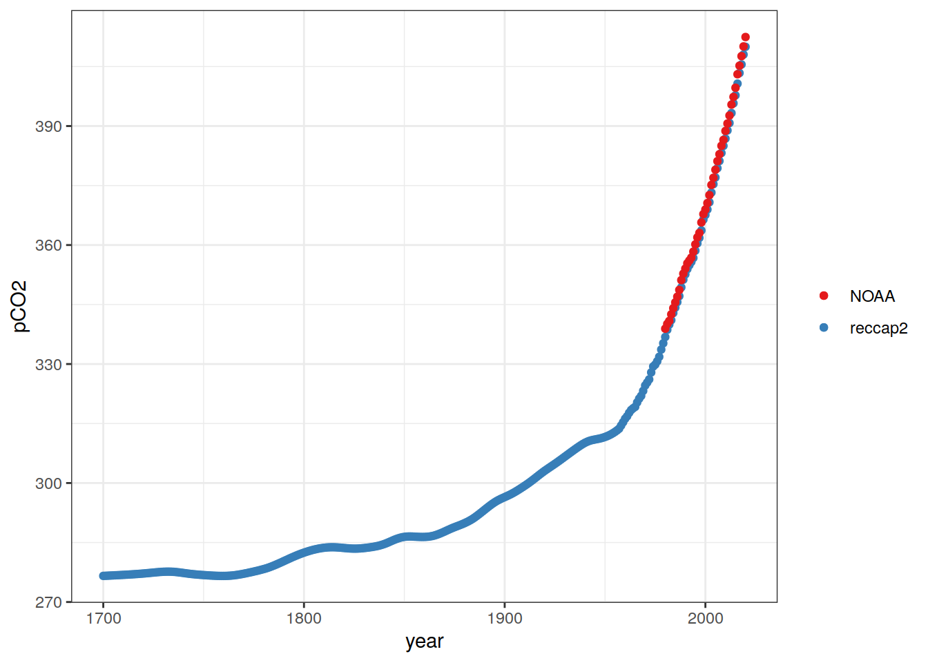 geom_point(data = co2_atm_reccap2, aes(year, pCO2, col="reccap2")) +