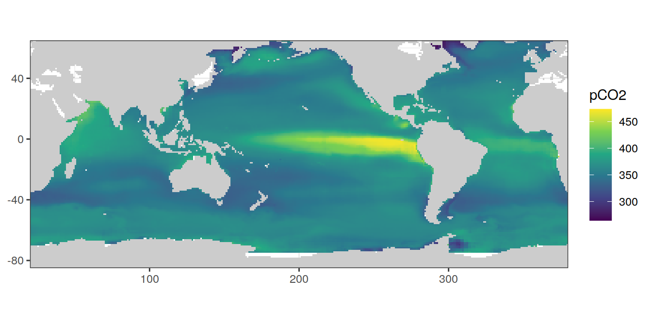 # ggplot(aes(lon, lat, fill = pCO2)) +