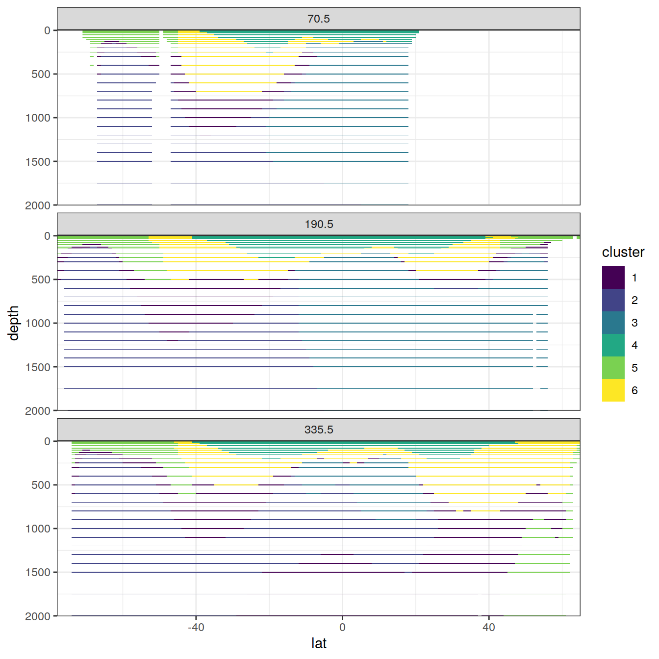 aes(lat, depth, fill = cluster)