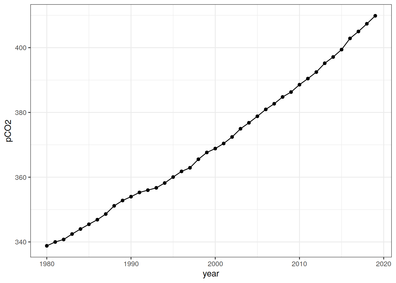 Globally averaged marine surface annual mean data from ESRL-NOAAco2_atm <- read_table2(