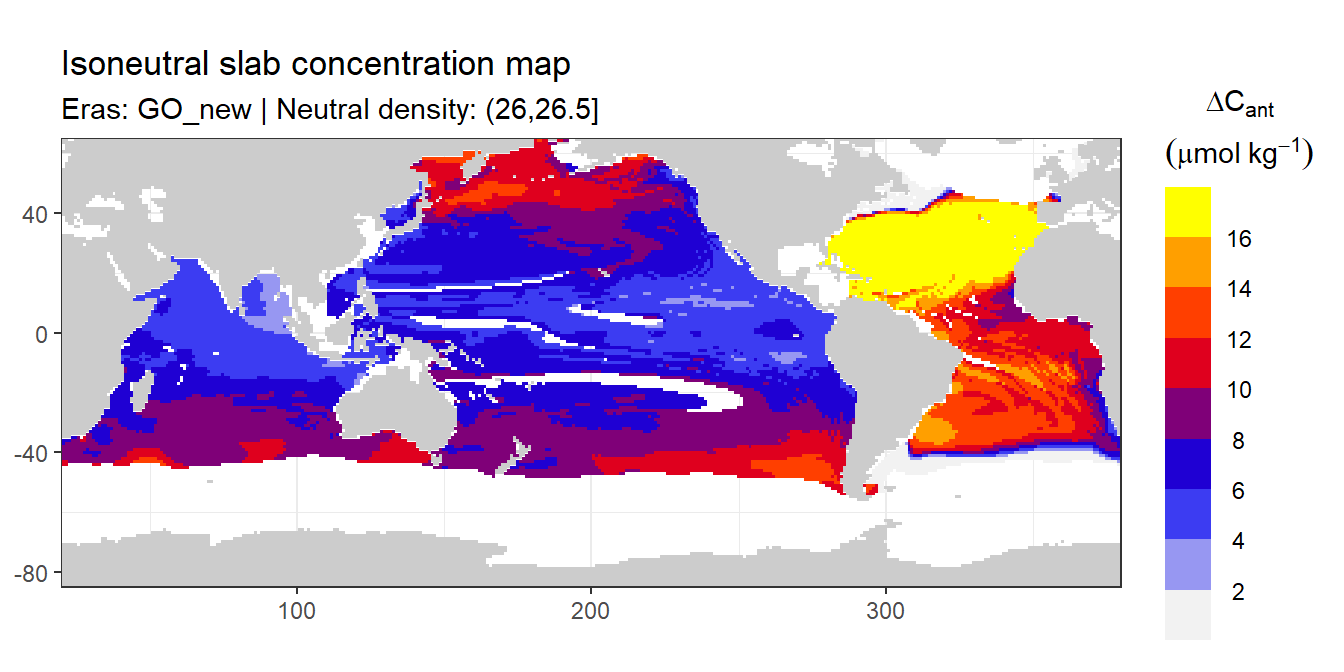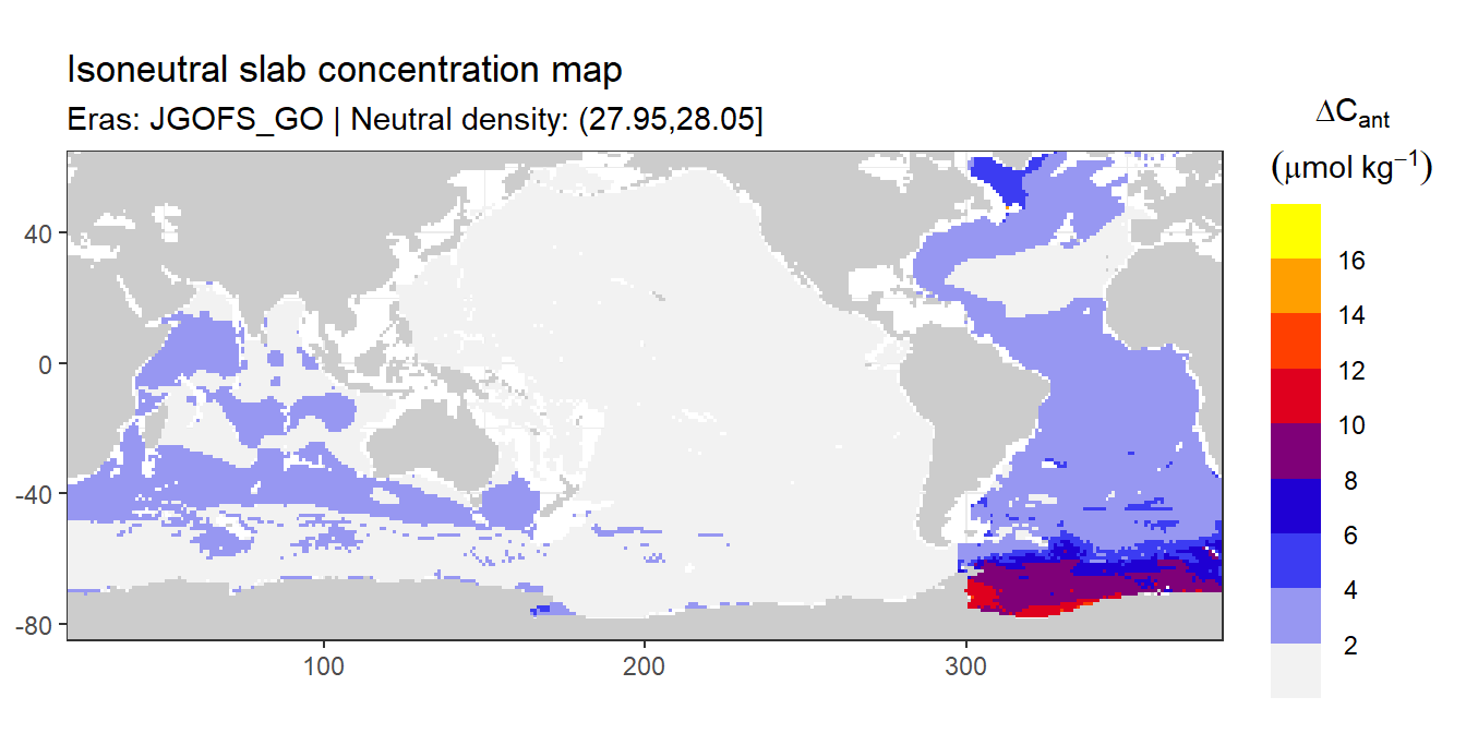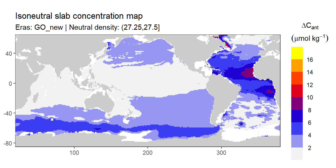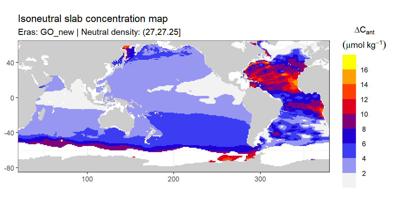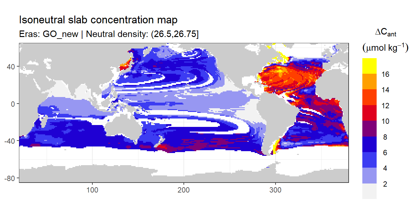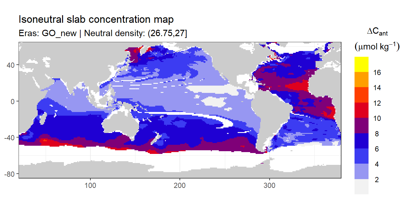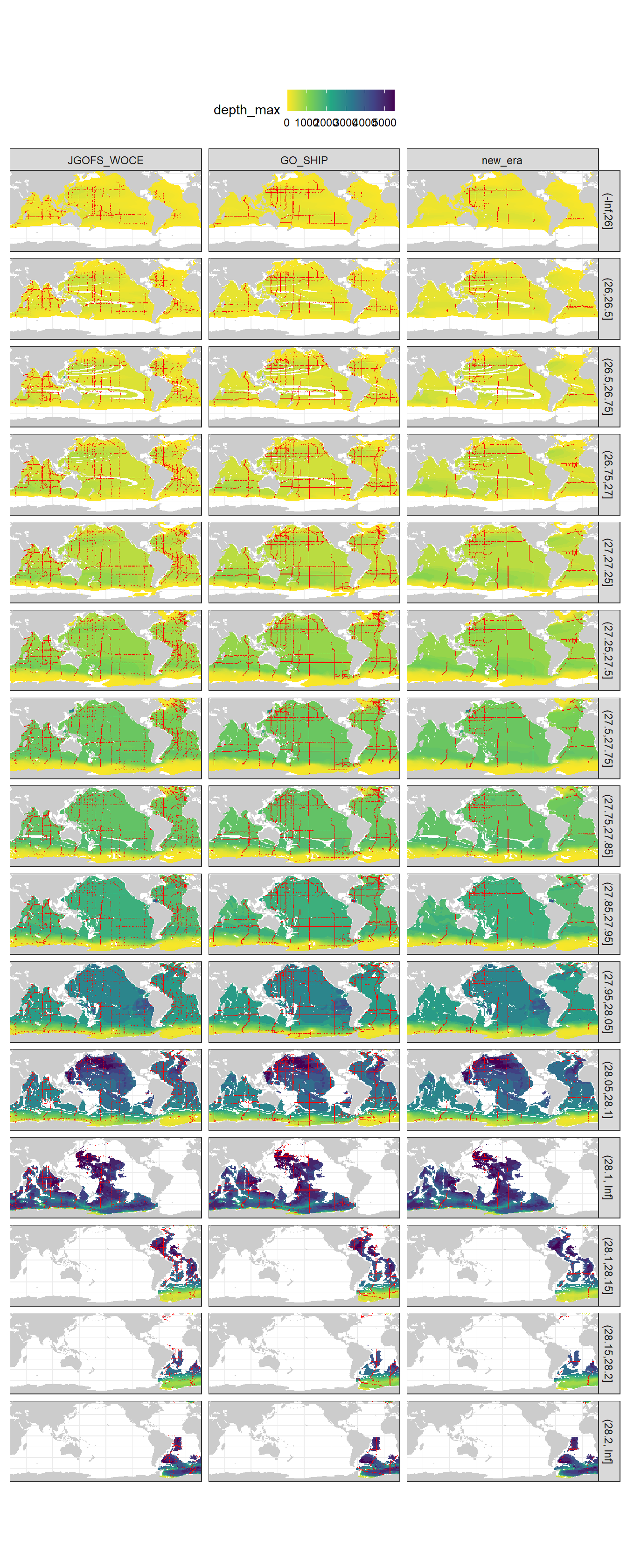 • predictor density slabs are only shown for the upper 3000m as used for the mapping, whereas GLODAP observations are displayed for the entire water column as used for fitting eMLRs (in both cases shallow waters are excluded at low density)