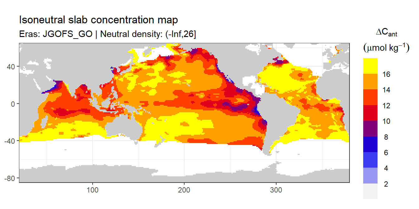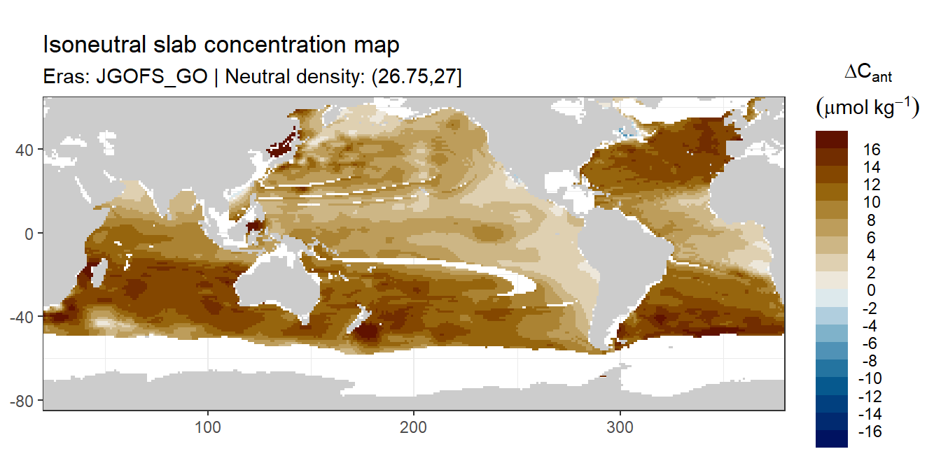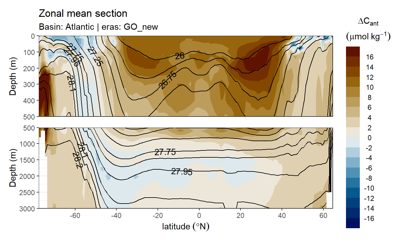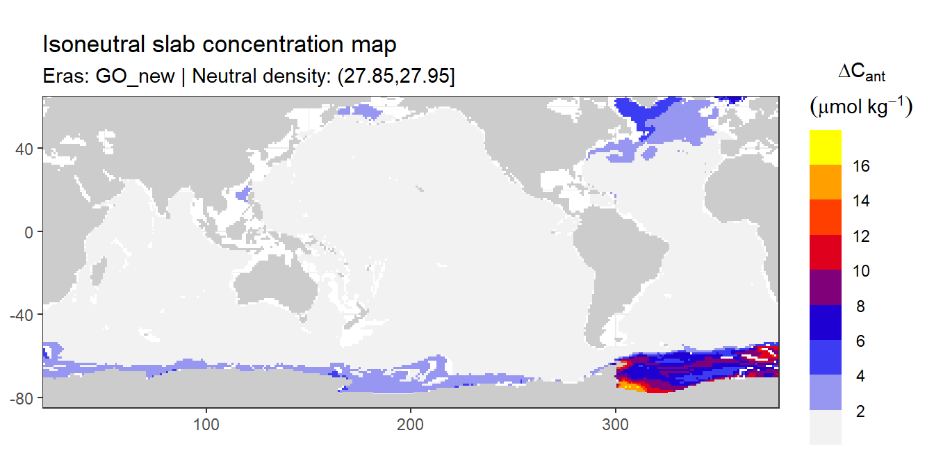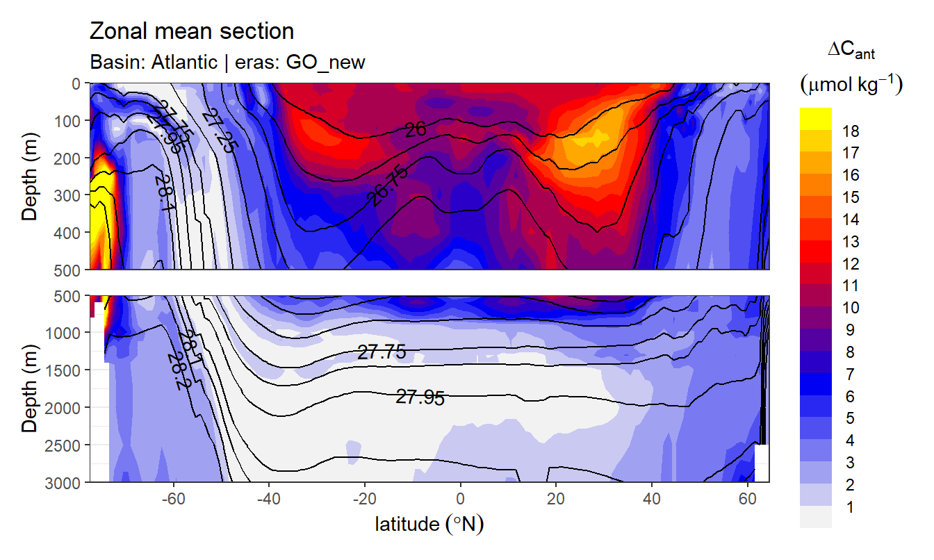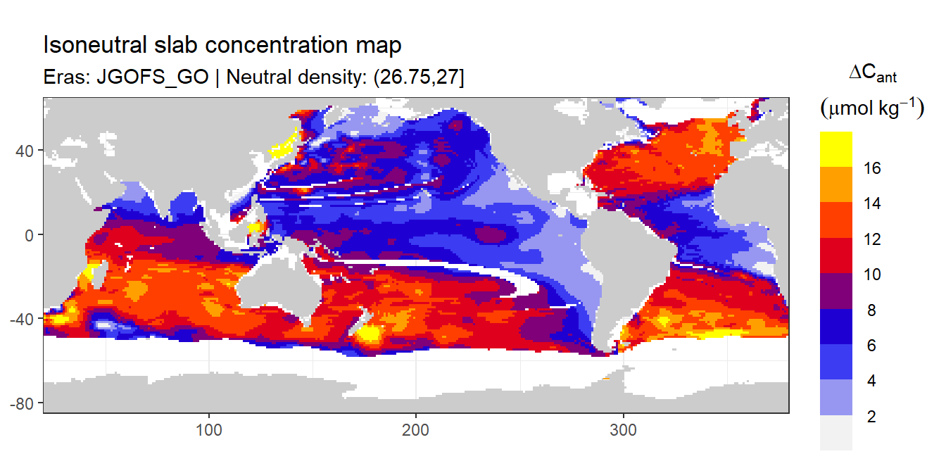 • predictor density slabs are only shown for the upper 3000m as used for the mapping, whereas GLODAP observations are displayed for the entire water column as used for fitting eMLRs (in both cases shallow waters are excluded at low density)