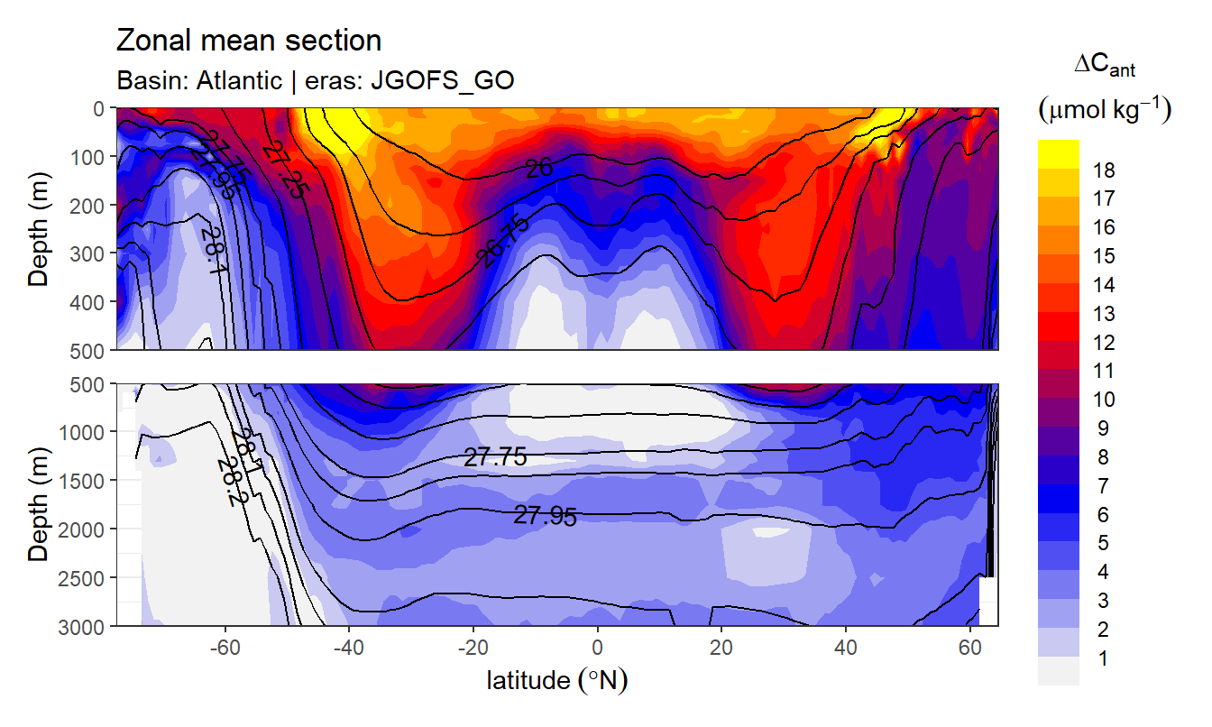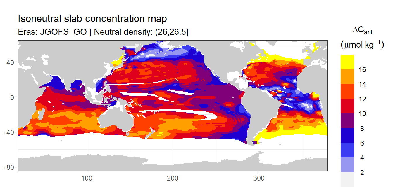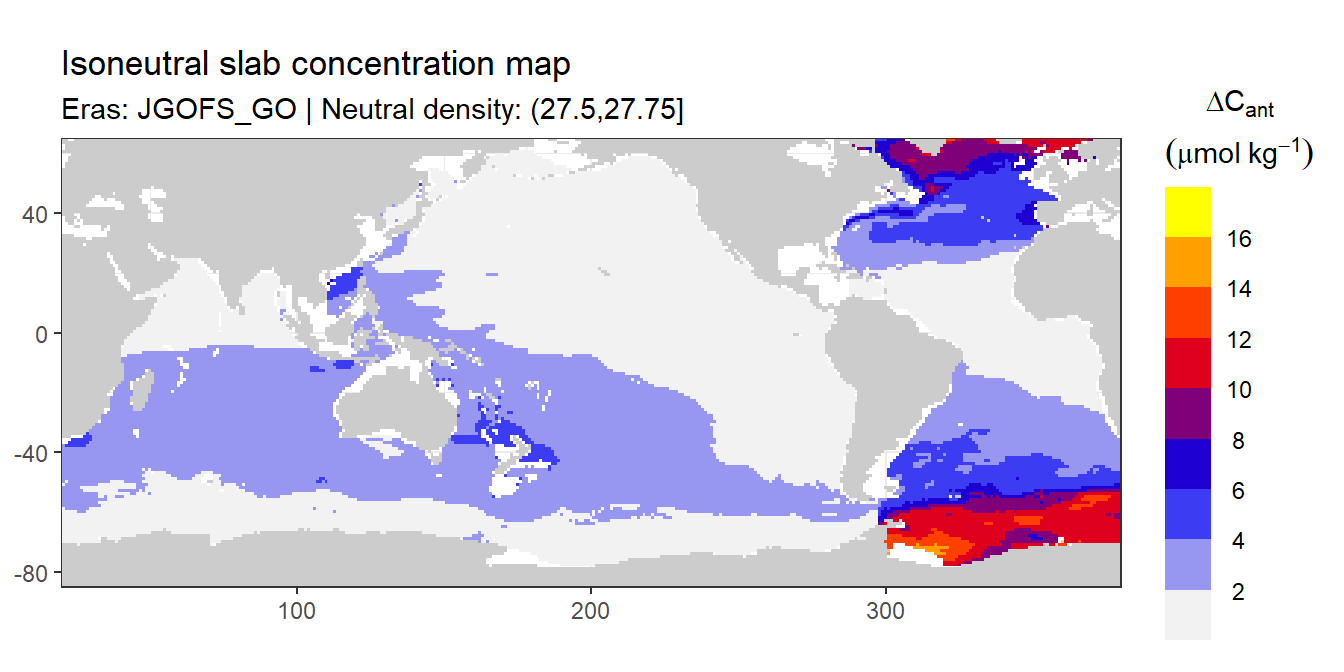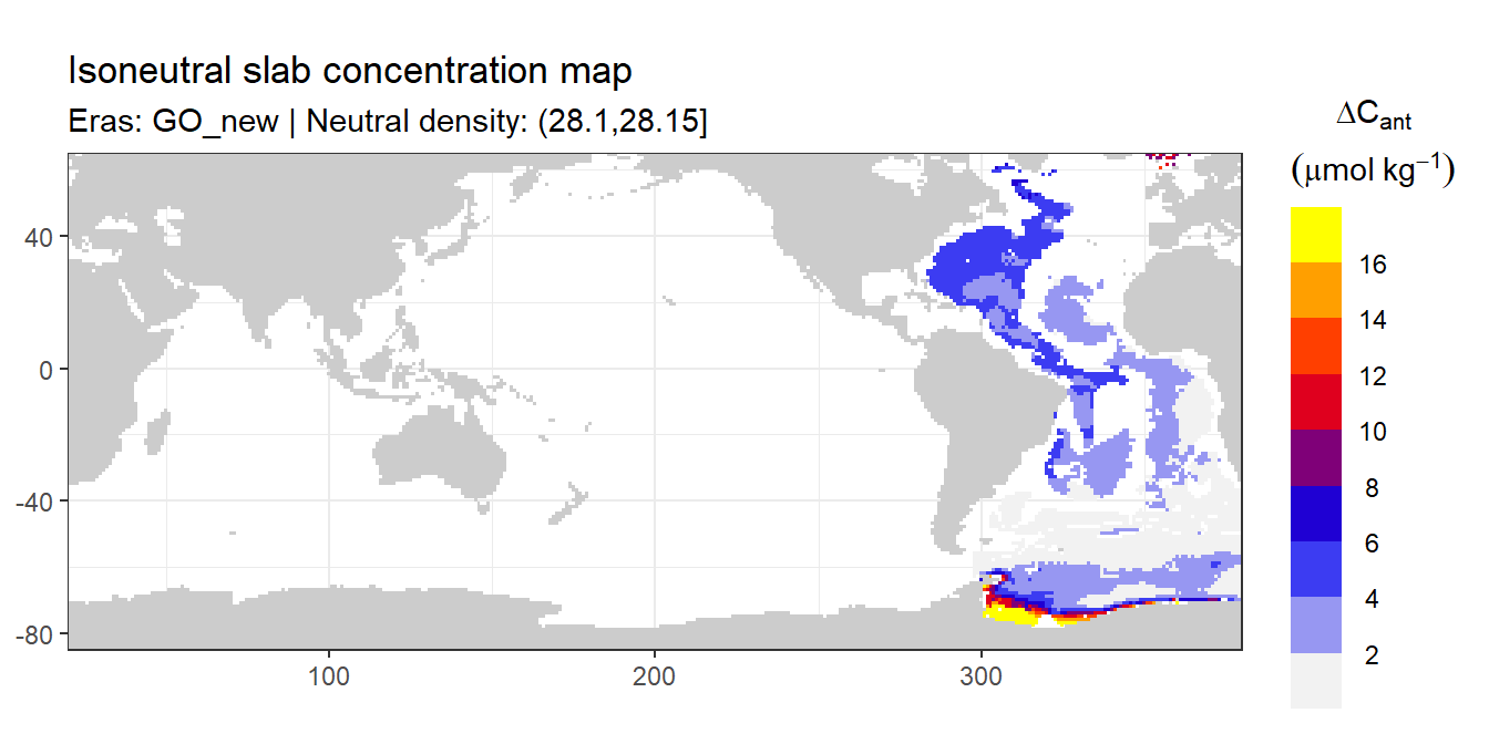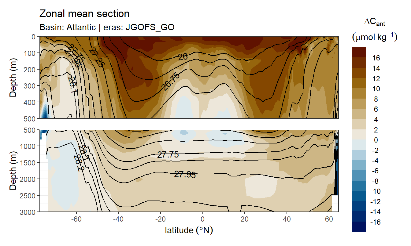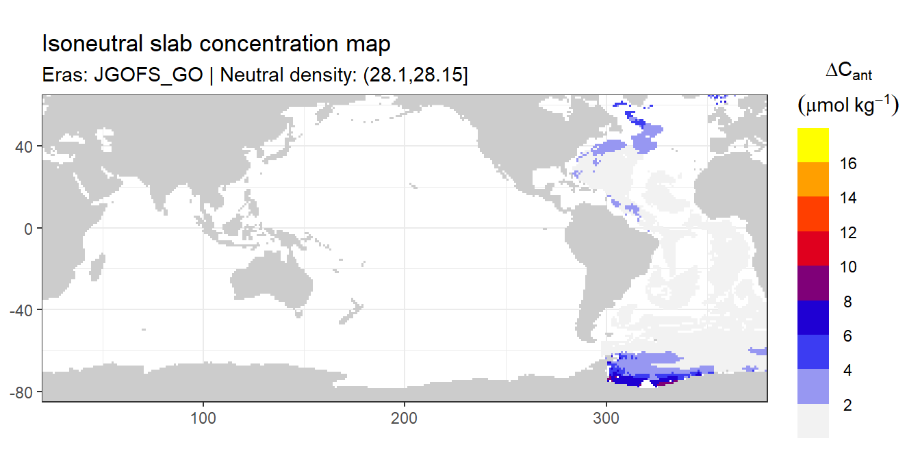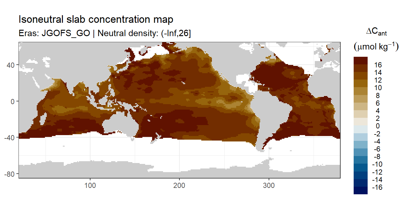 • predictor density slabs are only shown for the upper 3000m as used for the mapping, whereas GLODAP observations are displayed for the entire water column as used for fitting eMLRs (in both cases shallow waters are excluded at low density)