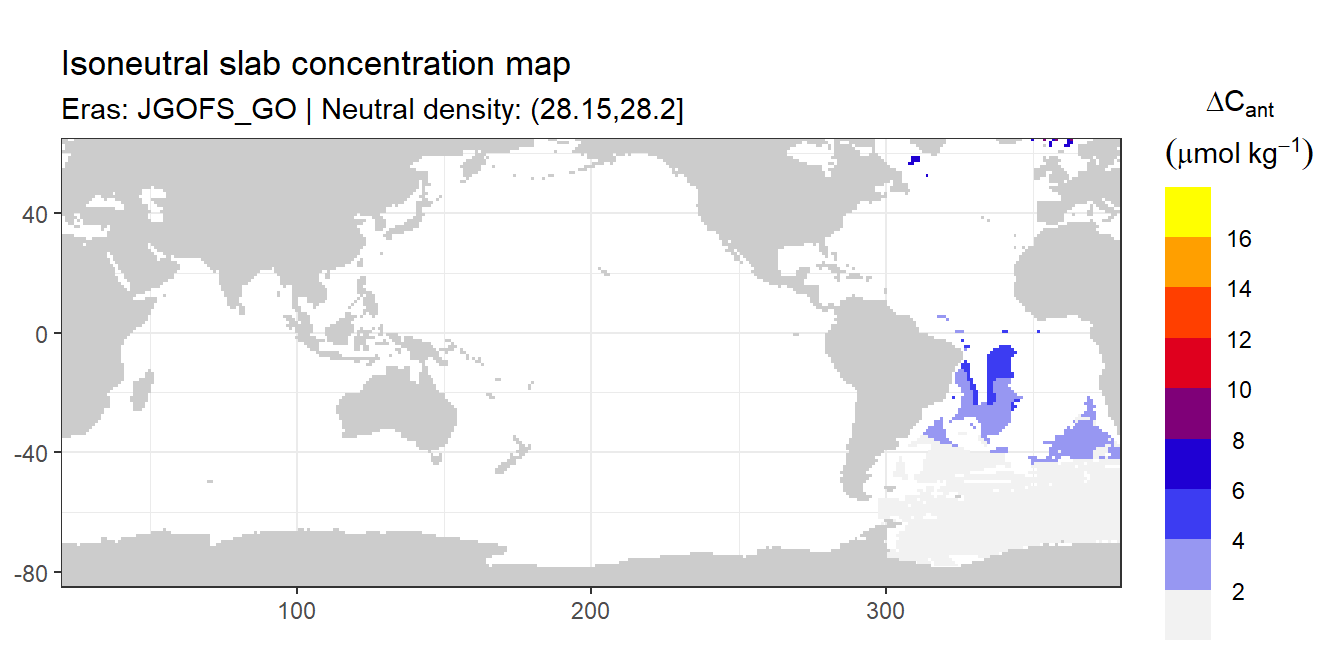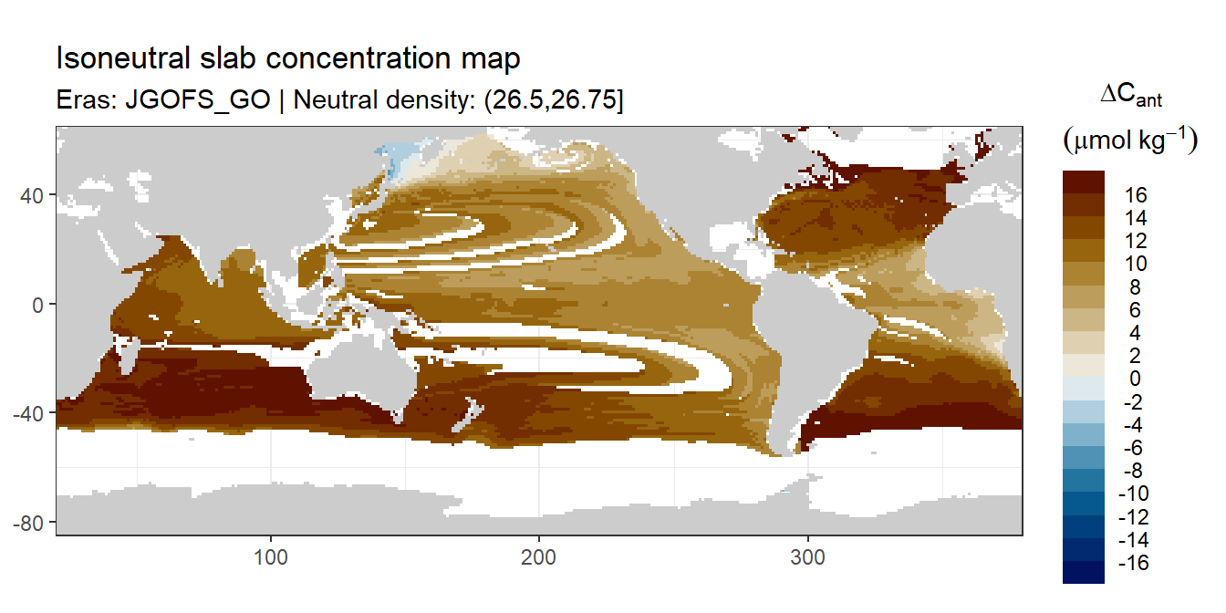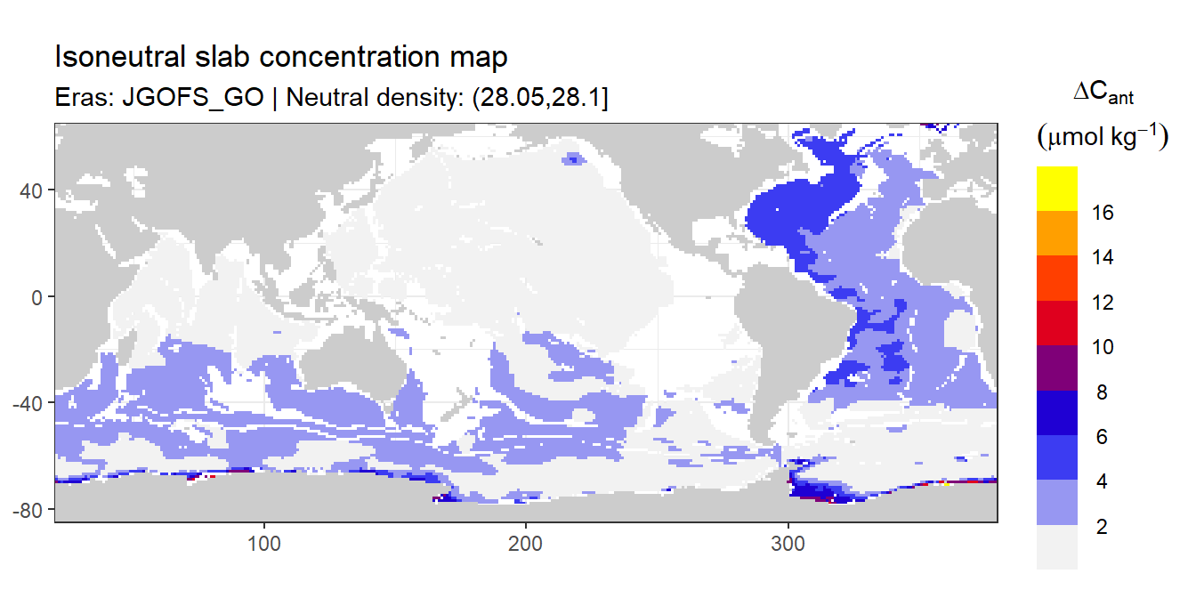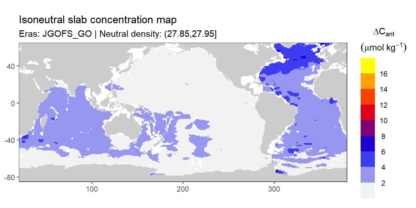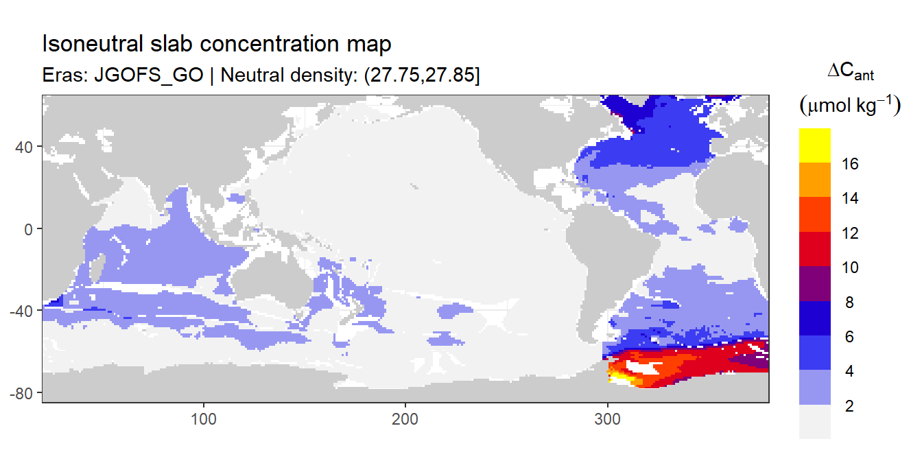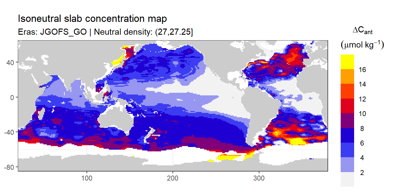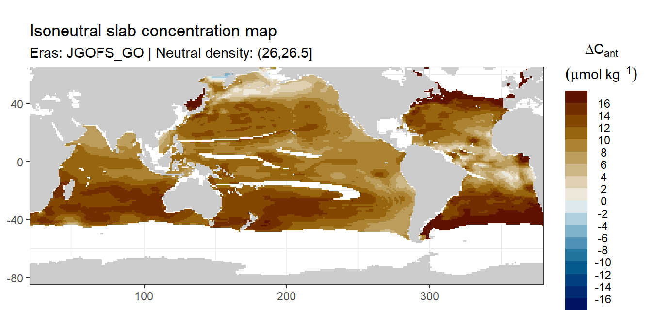 • predictor density slabs are only shown for the upper 3000m as used for the mapping, whereas GLODAP observations are displayed for the entire water column as used for fitting eMLRs (in both cases shallow waters are excluded at low density)