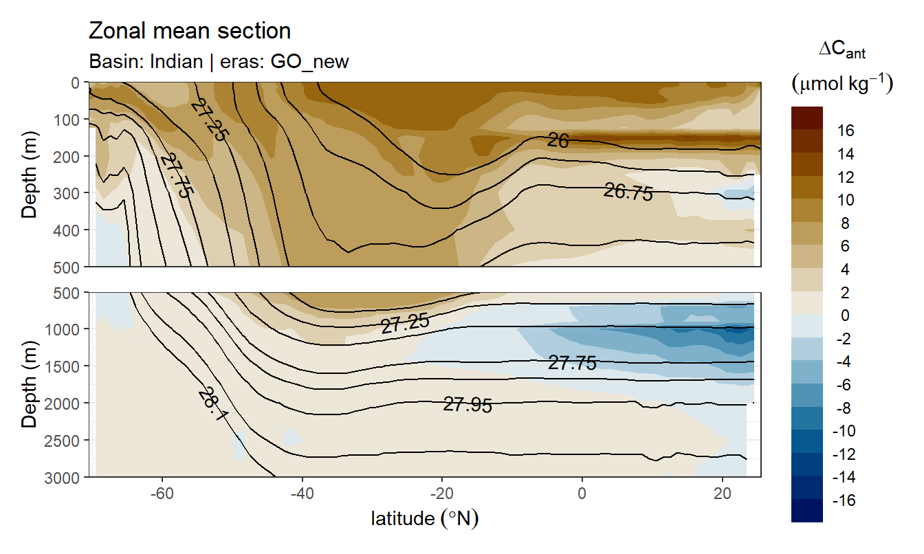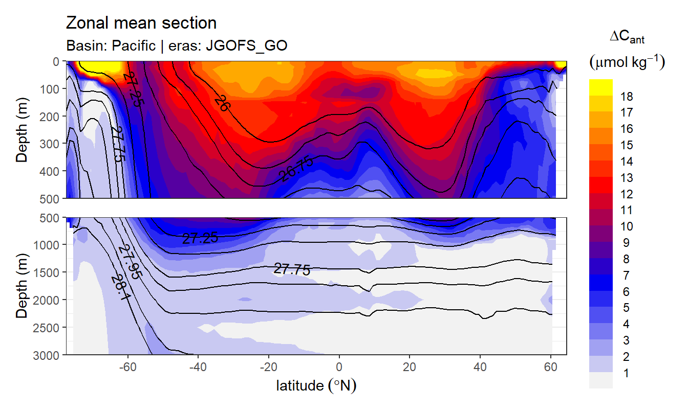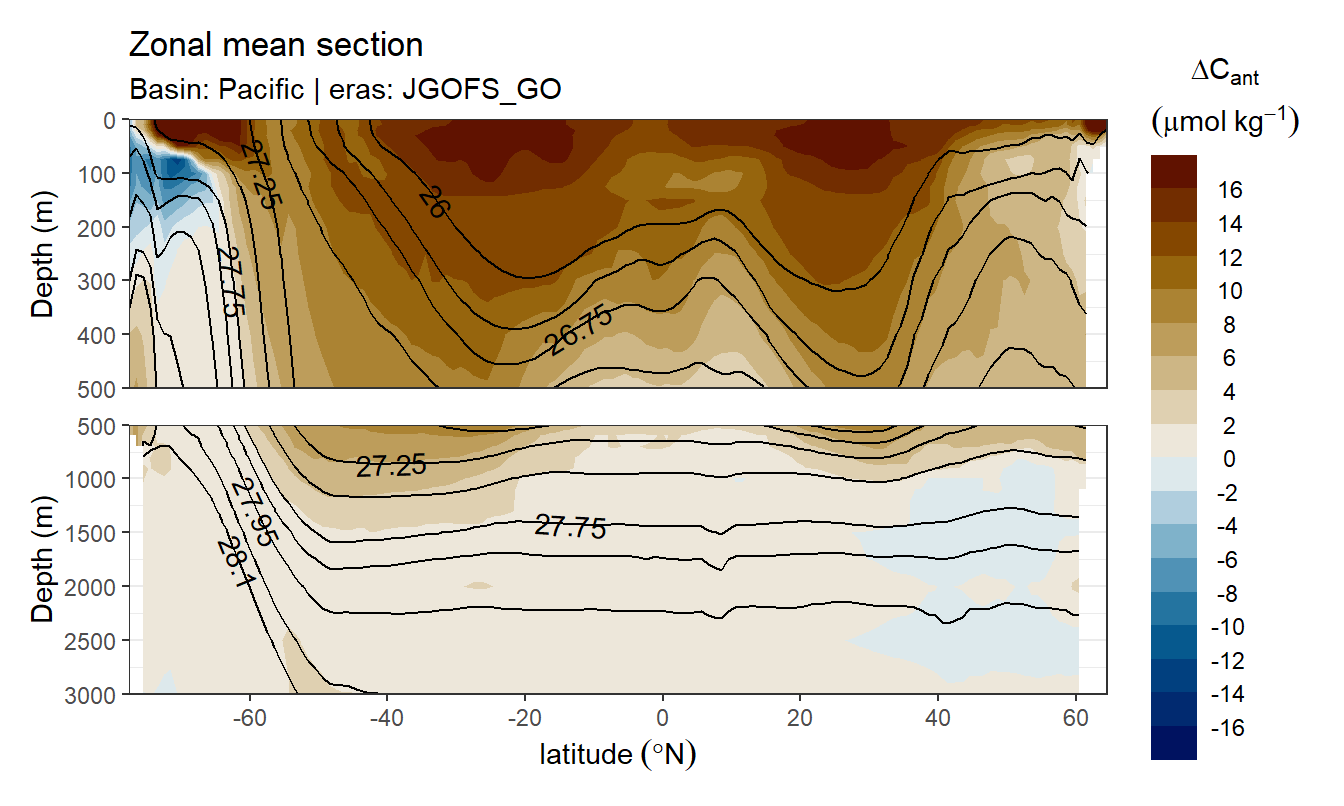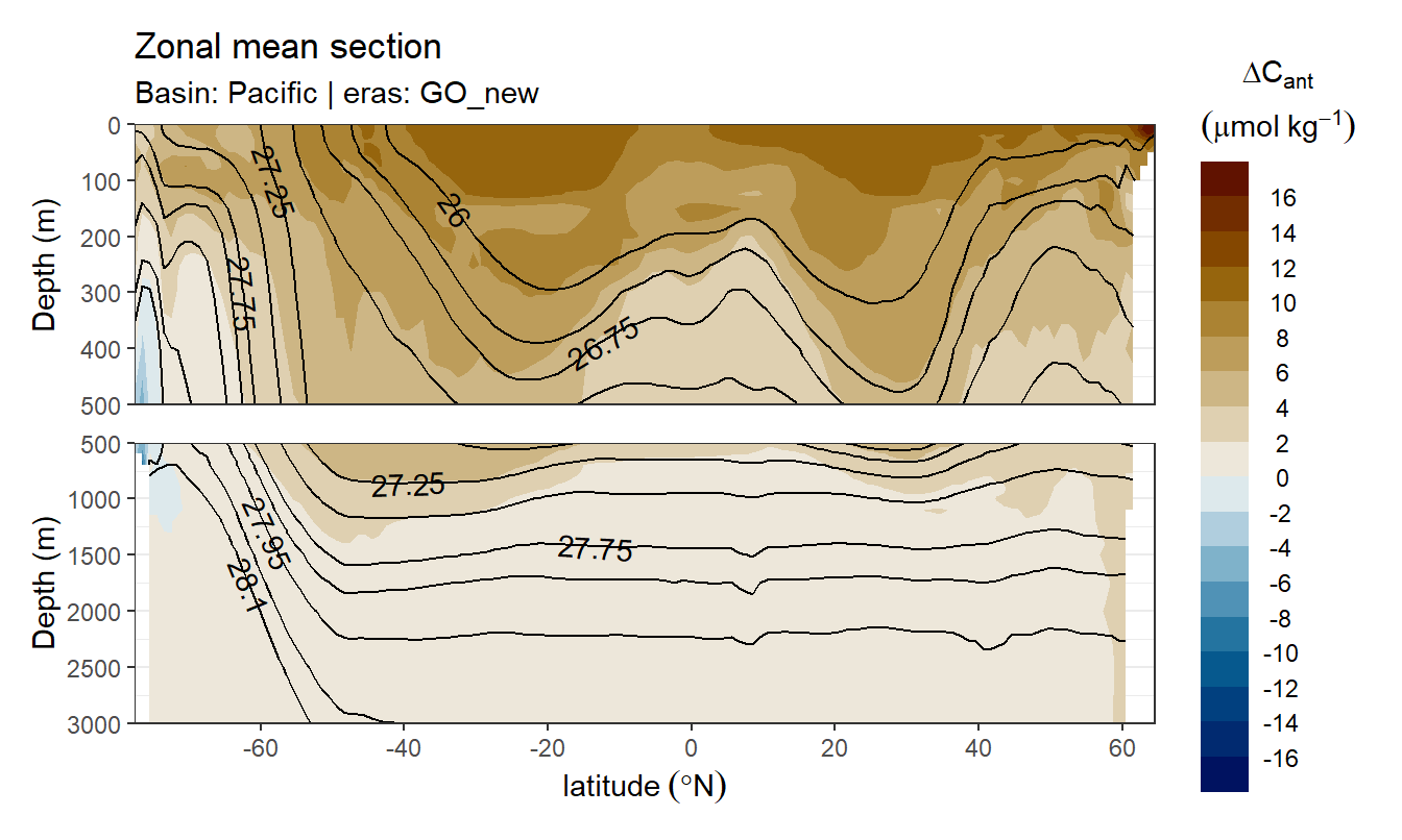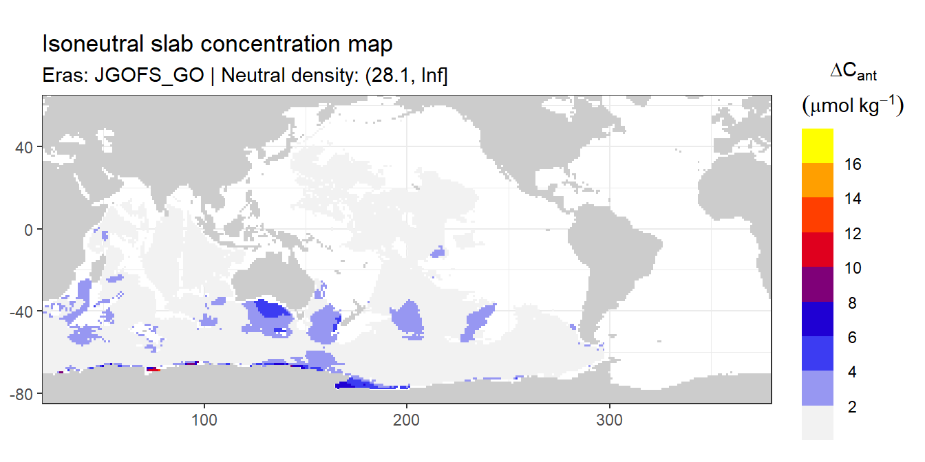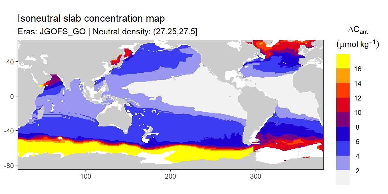 • predictor density slabs are only shown for the upper 3000m as used for the mapping, whereas GLODAP observations are displayed for the entire water column as used for fitting eMLRs (in both cases shallow waters are excluded at low density)