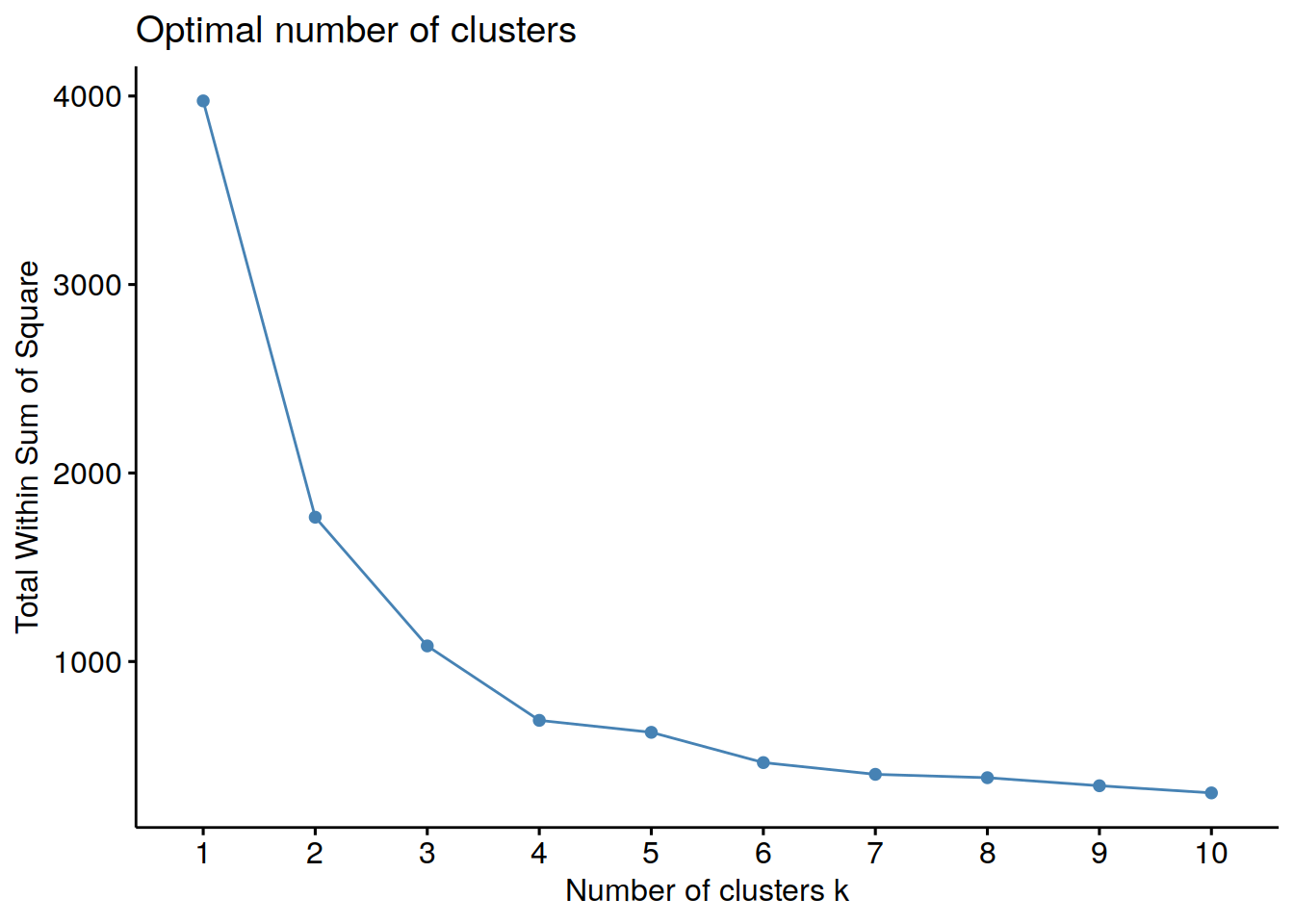 Based on a random subset of 1000 data points, the optimum number of clusters was inspected as elbow plot.