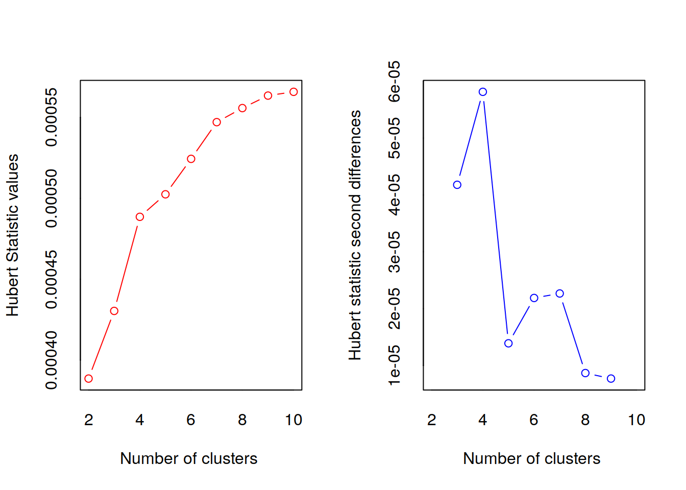 In the plot of Hubert index, we seek a significant knee that corresponds to a