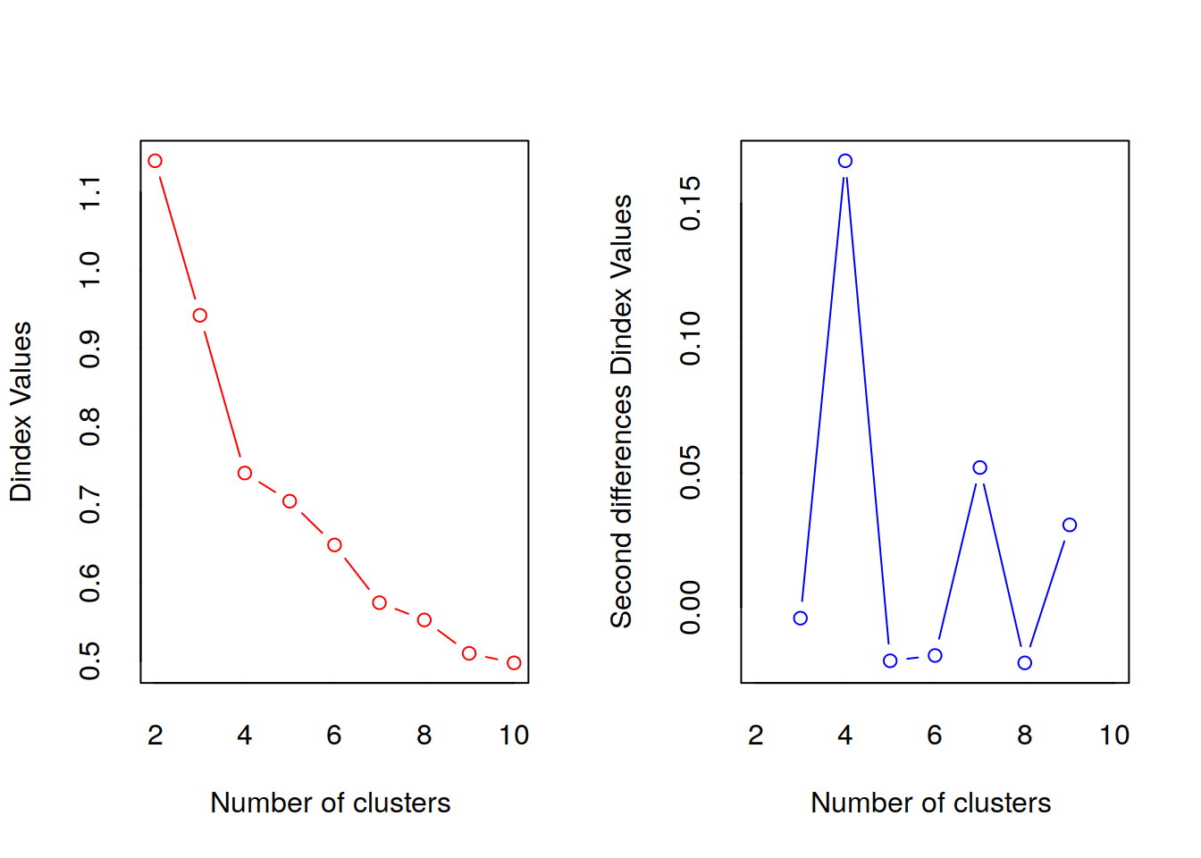 In the plot of D index, we seek a significant knee (the significant peak in Dindex