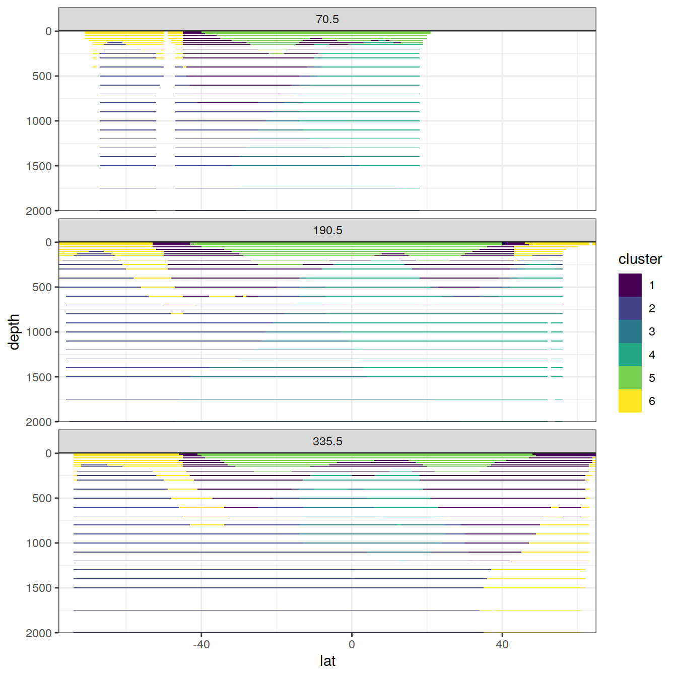 aes(lat, depth, fill = cluster)