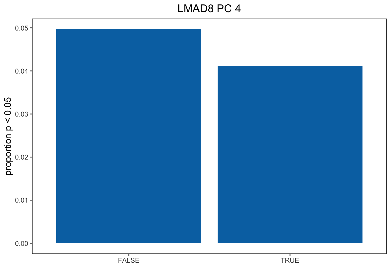 pl1 <- ggplot(data = df1, aes(x = CR, y = Freq)) + geom_bar(stat="identity", fill = col)  +  ylab("proportion p < 0.05") + xlab("") + theme_bw() + theme(panel.grid.major = element_blank(), panel.grid.minor = element_blank(), axis.title.y = element_text(size=12), axis.title.x  = element_text(size=12), legend.position = "right", legend.title = element_text(size = 12), legend.text = element_text(size = 10)) + ggtitle("LMAD8 PC 4") + theme(plot.title = element_text(hjust = 0.5, size = 14))