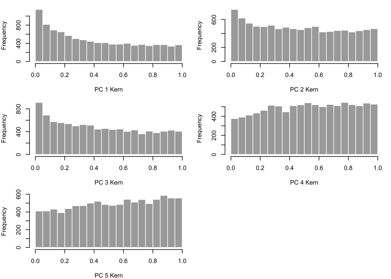 hist(pvals[,x], border="white", col = "darkgray", main="", breaks = 20, xlab = paste('PC ',x,' ',alltissues[i],sep=""))