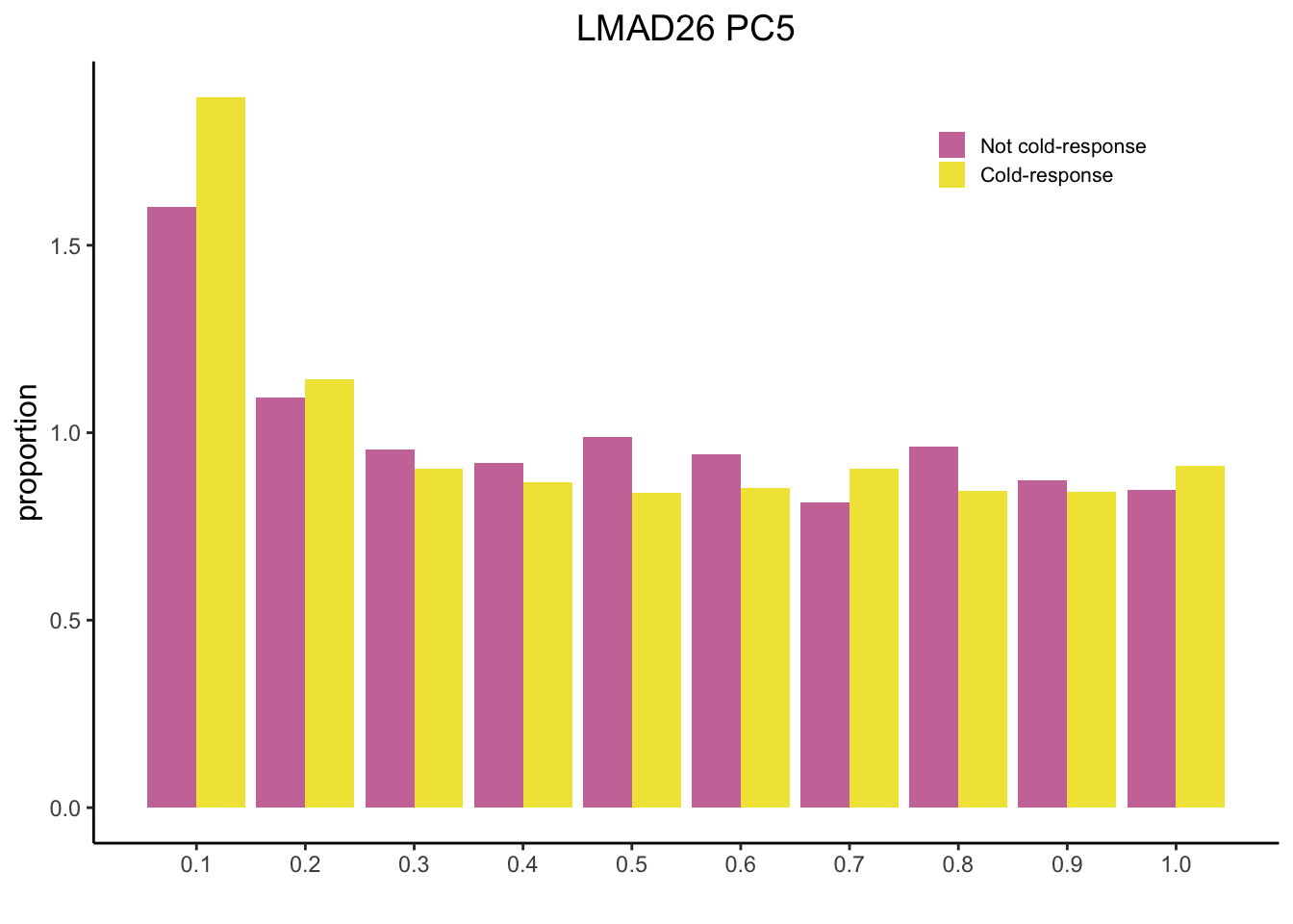 pl2 <- ggplot(data = m, aes(x = Var1/10, y = value, fill = Var2)) + geom_bar(stat="identity",position="dodge") + scale_fill_manual(name = "", values = c("#CC79A7", "#F0E442")) + theme_classic() + ylab("proportion") + xlab("") + scale_x_continuous(breaks=seq(0, 1, 0.1)) + theme(legend.position = c(0.8, 0.9)) + ggtitle("LMAD26 PC5") + theme(plot.title = element_text(hjust = 0.5, size = 14), axis.title.y = element_text(size=12), legend.text = element_text(size=8), legend.key.size = unit(0.8, "line"))