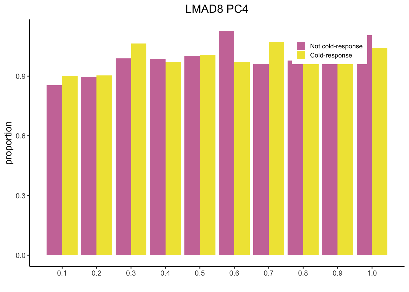 pl2 <- ggplot(data = m, aes(x = Var1/10, y = value, fill = Var2)) + geom_bar(stat="identity",position="dodge") + scale_fill_manual(name = "", values = c("#CC79A7", "#F0E442")) + theme_classic() + ylab("proportion") + xlab("") + scale_x_continuous(breaks=seq(0, 1, 0.1)) + theme(legend.position = c(0.8, 0.9)) + ggtitle("LMAD8 PC4") + theme(plot.title = element_text(hjust = 0.5, size = 14), axis.title.y = element_text(size=12), legend.text = element_text(size=8), legend.key.size = unit(0.8, "line"))