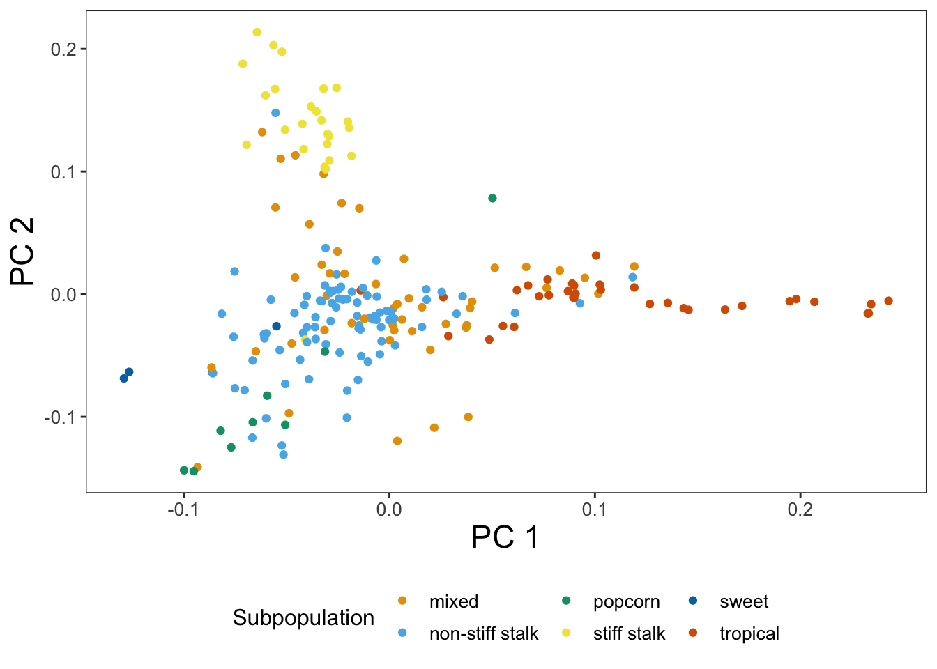 pl <- ggplot(data=pop_dat, aes(x = one, y= two , color=Subpopulation)) + scale_colour_manual(values = col, labels=c("mixed", "non-stiff stalk", "popcorn", "stiff stalk", "sweet", "tropical")) + xlab("PC 1") +  ylab("PC 2") + theme_bw() + theme(panel.grid.major = element_blank(), panel.grid.minor = element_blank(), axis.title.y = element_text(size=17), axis.title.x  = element_text(size=17), legend.position = "bottom", legend.title = element_text(size = 12), legend.text = element_text(size = 10), plot.title = element_text(), axis.text.y = element_text(size=10), axis.text.x = element_text(size=10)) + geom_point(size = 1.5)