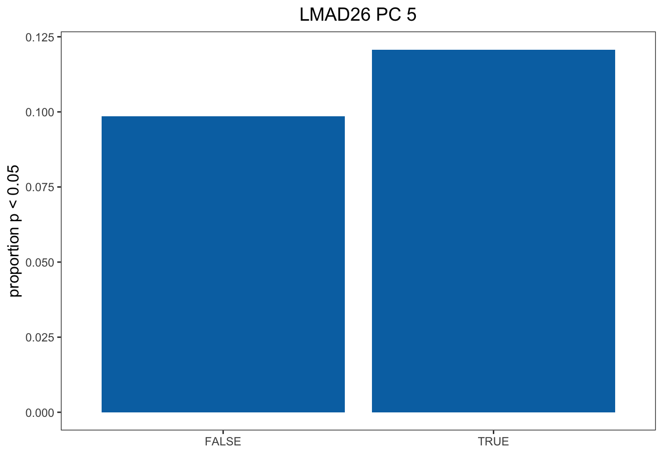 pl1 <- ggplot(data = df1, aes(x = CR, y = Freq)) + geom_bar(stat="identity", fill = col) + ylab("proportion p < 0.05") + xlab("") + theme_bw() + theme(panel.grid.major = element_blank(), panel.grid.minor = element_blank(), axis.title.y = element_text(size=12), axis.title.x = element_text(size=12), legend.position = "right", legend.title = element_text(size = 12), legend.text = element_text(size = 10)) + ggtitle("LMAD26 PC 5") + theme(plot.title = element_text(hjust = 0.5, size = 14))